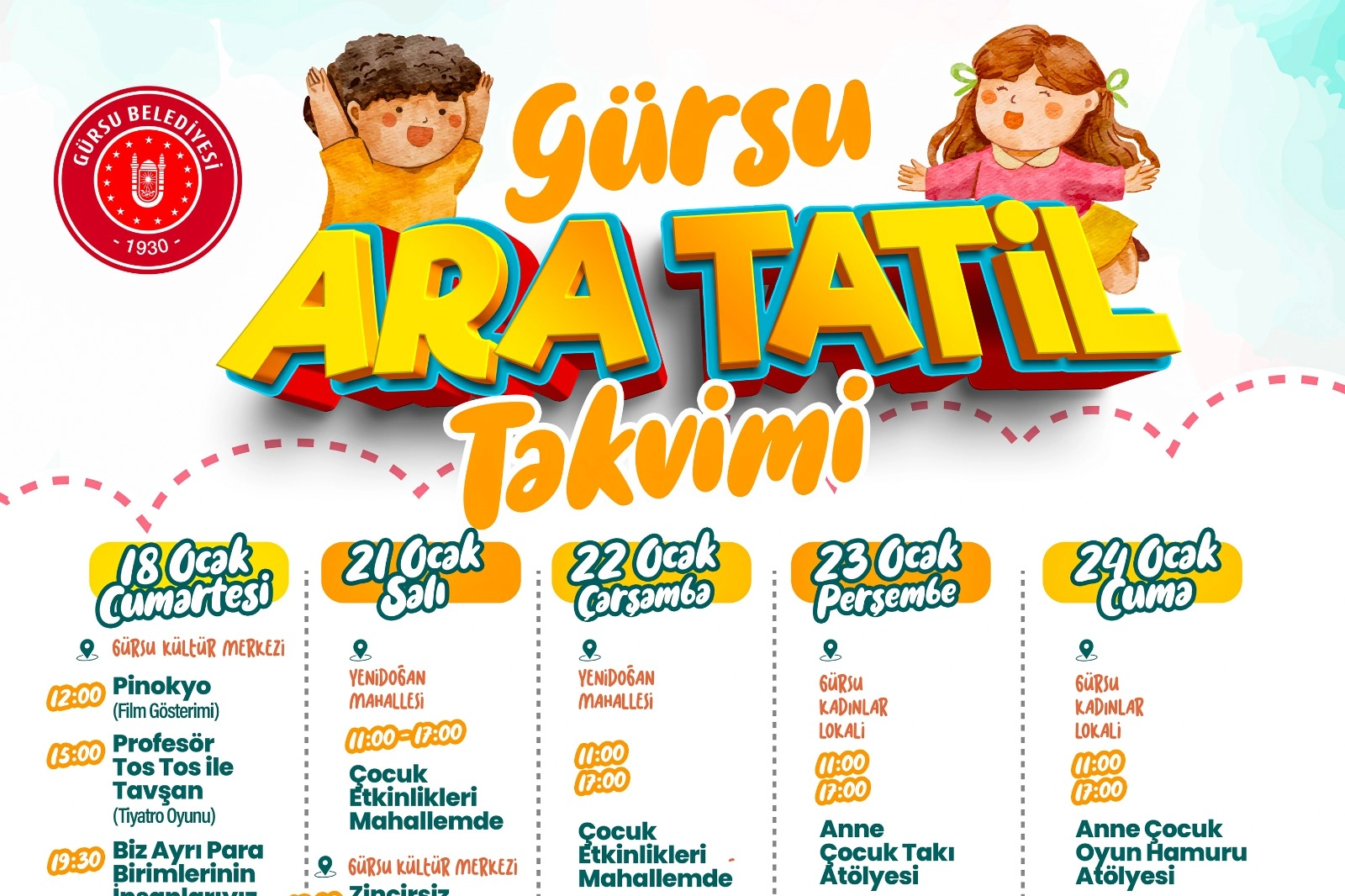 Gürsu Belediyesi ara tatile özel hazırladığı özel etkinlik takviminde çocuk tiyatro ve filmleri, anne çocuk atölyeleri, mahallelere özel hazırlanan etkinlik ve eğlenceleri, sağlık eğitimleri, özel geziler ile çocuklara unutulmaz bir tatil yaşatacak.