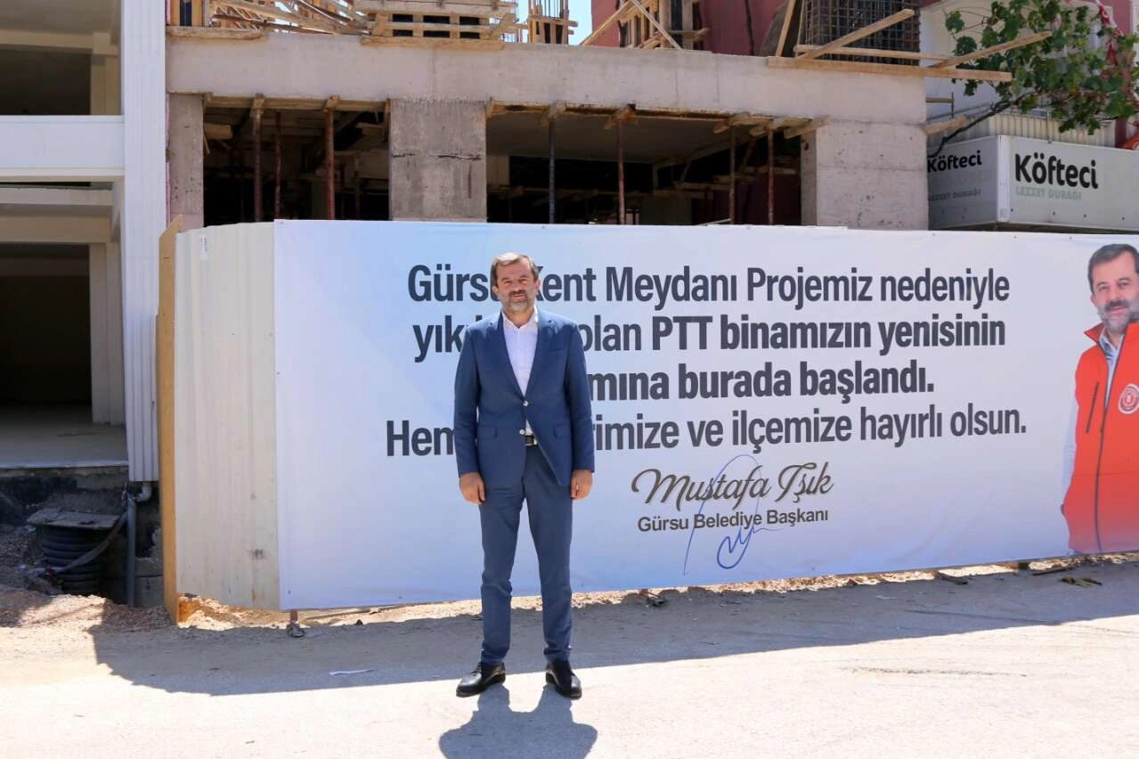 Mevcut PTT binasında elli metre uzaklıktaki yeni PTT binasının inşaatı yükselirken, yerinde incelemelerde bulunan Gürsu Belediye Başkanı Mustafa Işık, " Burada yapımına devam ettiğimiz PTT binamızda hemşehrilerimiz en küçük bir aksaklık ya da zaman kaybı yaşamasınlar diye adeta zaman ile yarışıyoruz. Diğer yandan da mevcut binamızın yıkım işlemlerinin çalışmalarına devam ediyoruz. En büyük heyecanı ise PTT binası yıkıldıktan sonra meydanımızın asıl alanı ortaya çıktığında yaşayacağız" diye konuştu