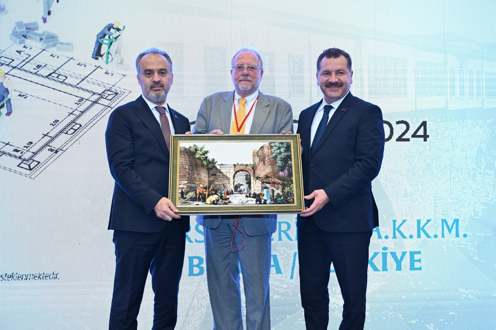 Açılış konuşmalarının ardından Bursa Büyükşehir Belediye Başkanı Alinur Aktaş ve Balıkesir Büyükşehir Belediye Başkanı Yücel Yılmaz, Prof. Karl-Heinz Noetel’e günün anısına tarihi İznik surlarından Lefke kapının ipeğe işlenmiş tablosunu hediye etti.