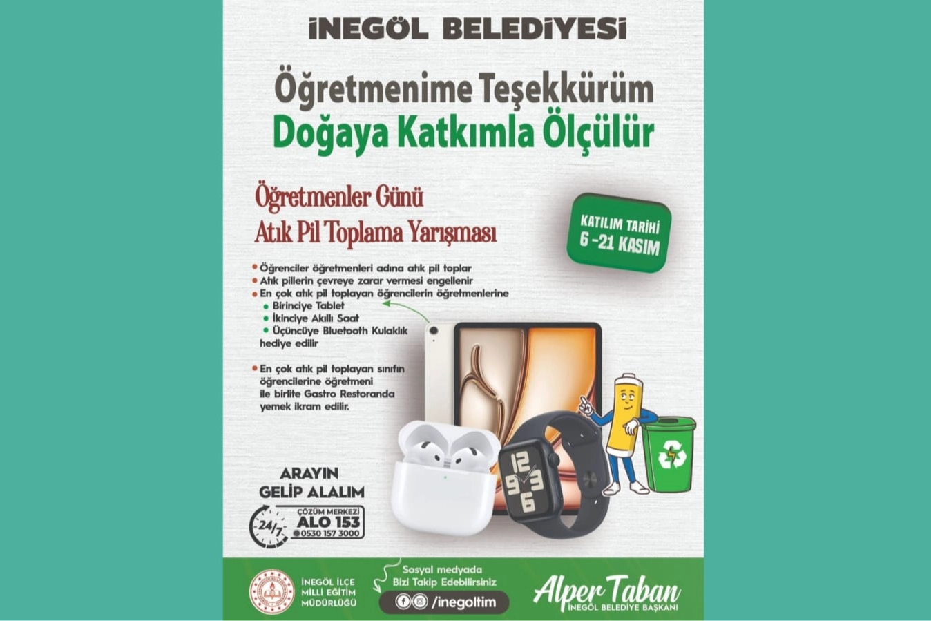 İnegöl Belediyesi, 24 Kasım Öğretmenler Günü için atık pil toplama kampanyası başlattı. Öğrencilerin öğretmenleri adına atık pil toplayarak katılacağı yarışmada, ilk 3’e giren sınıfların öğretmenlerine hediyeler verilecek. Birinci olan sınıfa ayrıca öğretmeniyle birlikte Gastro İnegöl’de yemek ikram edilecek.