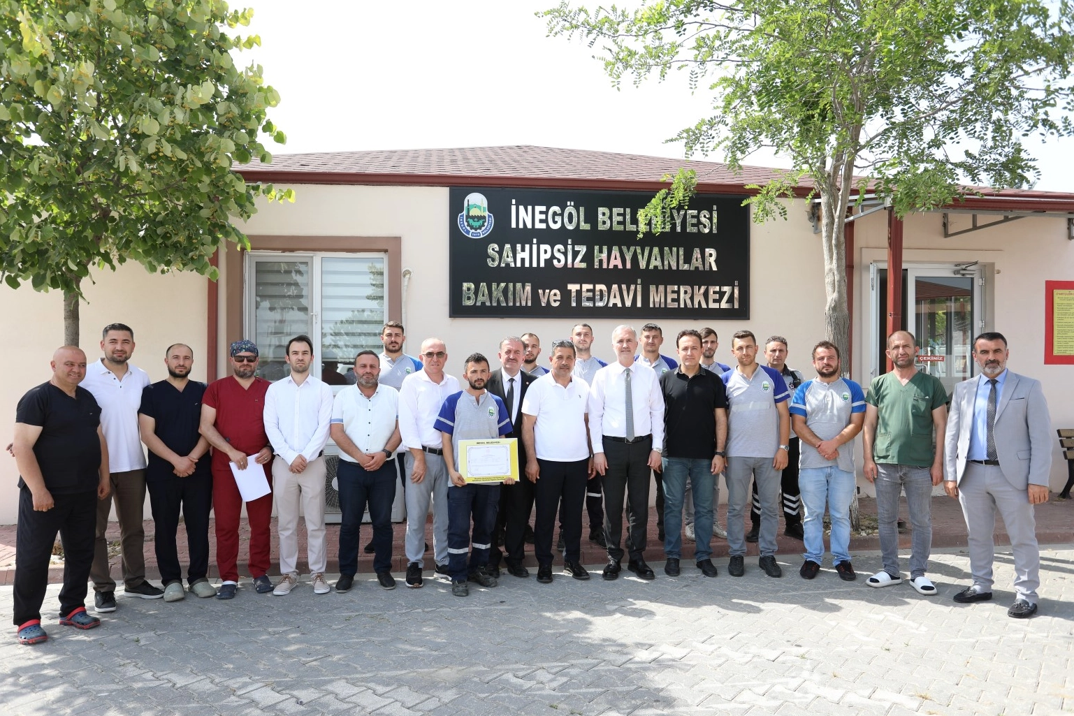İnegöl Belediyesi Veteriner İşleri Müdürlüğü bünyesinde görev yapan personellere Halk Eğitim Merkezi iş birliğinde 96 saatlik “Başıboş Hayvanları Yakalama ve Müdahale” eğitimi verildi. Bu eğitimle bilgileri güncellenen ve daha donanımlı hale gelen saha ekiplerine sertifikalarını Belediye Başkanı Alper Taban takdim etti.