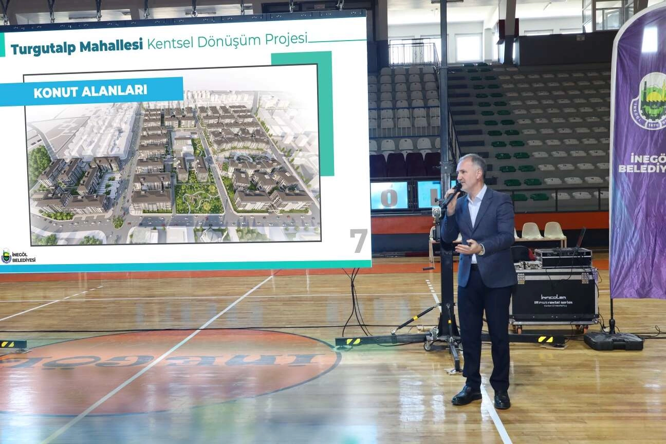 İnegöl Belediyesi şehrin ilk “Yerinde Kentsel Dönüşüm Projesi” için düğmeye bastı. Turgutalp Mahallesinde; Barbaros Caddesi, Mimar Sinan Caddesi, Mahmut Esat Bey Caddesi ve Kemalettin Sami Paşa Caddesi’nin kesişim noktasında bulunan 250 bin m2’lik alanda yapılması planlanan Kentsel Dönüşüm için projeler hazırlandı. Uzun soluklu bir hazırlık süreci neticesinde bölge bulunan 842 hak sahibi ile ilk buluşma Pazar günü gerçekleştirildi. Hak sahiplerine projeyle ilgili genel bilgilerin verildiği istişare toplantısı İlçe Kapalı Spor Salonunda gerçekleştirildi. Burada Belediye Başkanı Alper Taban, yapılacak dönüşümü sunum eşliğinde vatandaşlara anlattı.