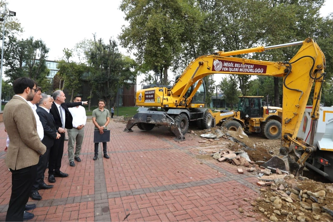 İnegöl Belediyesi, yeni belediye binasının bulunduğu meydan ile Merkez Parkı tamamlayarak şehrin yeni meydanını oluşturacak heykel bölgesinde düzenleme çalışmalarına başladı.