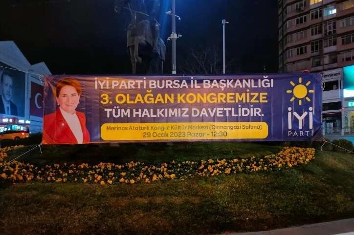 "Bilindiği gibi 29 Ocak Pazar Günü saat 12.30'da Merinos Atatürk Kongre Kültür Merkezi'nde İl Teşkilatımızın 3. Olağan Kongresi'ni gerçekleştireceğiz. Bununla ilgili duyuru niteliği taşıyan pankartlarımızı, Valilik ve Emniyetimize yaptığımız yasal izin bildirimleriyle birlikte, şehrimizin belli başlı kavşak ve noktalarına astık. Dün itibarı ile bu pankartlarımızın büyük bölümünün Büyükşehir Zabıtası ekiplerince toplatıldığını gördük. Daha, Cumhurbaşkanı'nın mitingiyle ilgili afiş ve pankartlar bile, üzerinden geçmesine rağmen yerlerinde dururken, İYİ Parti kongre duyurularının apar topar, üstelik partimize de bilgi verilme zahmetine dahi katlanılmadan toplatılmasının anlamı nedir?