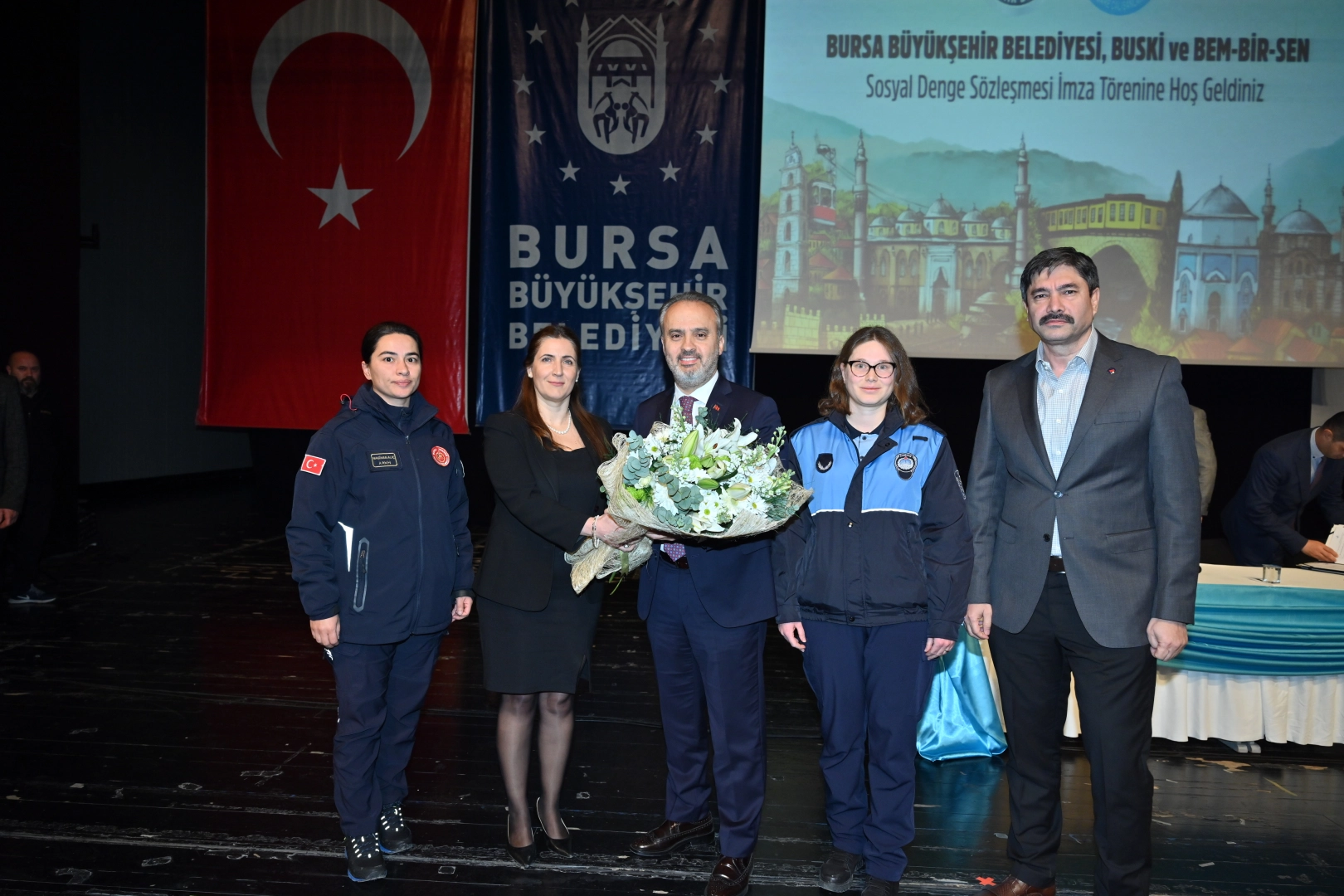 Konuşmaların ardından sosyal denge sözleşmesine imzalar atılırken, kadın memurlar Başkan Aktaş’a teşekkür için çiçek verdi.