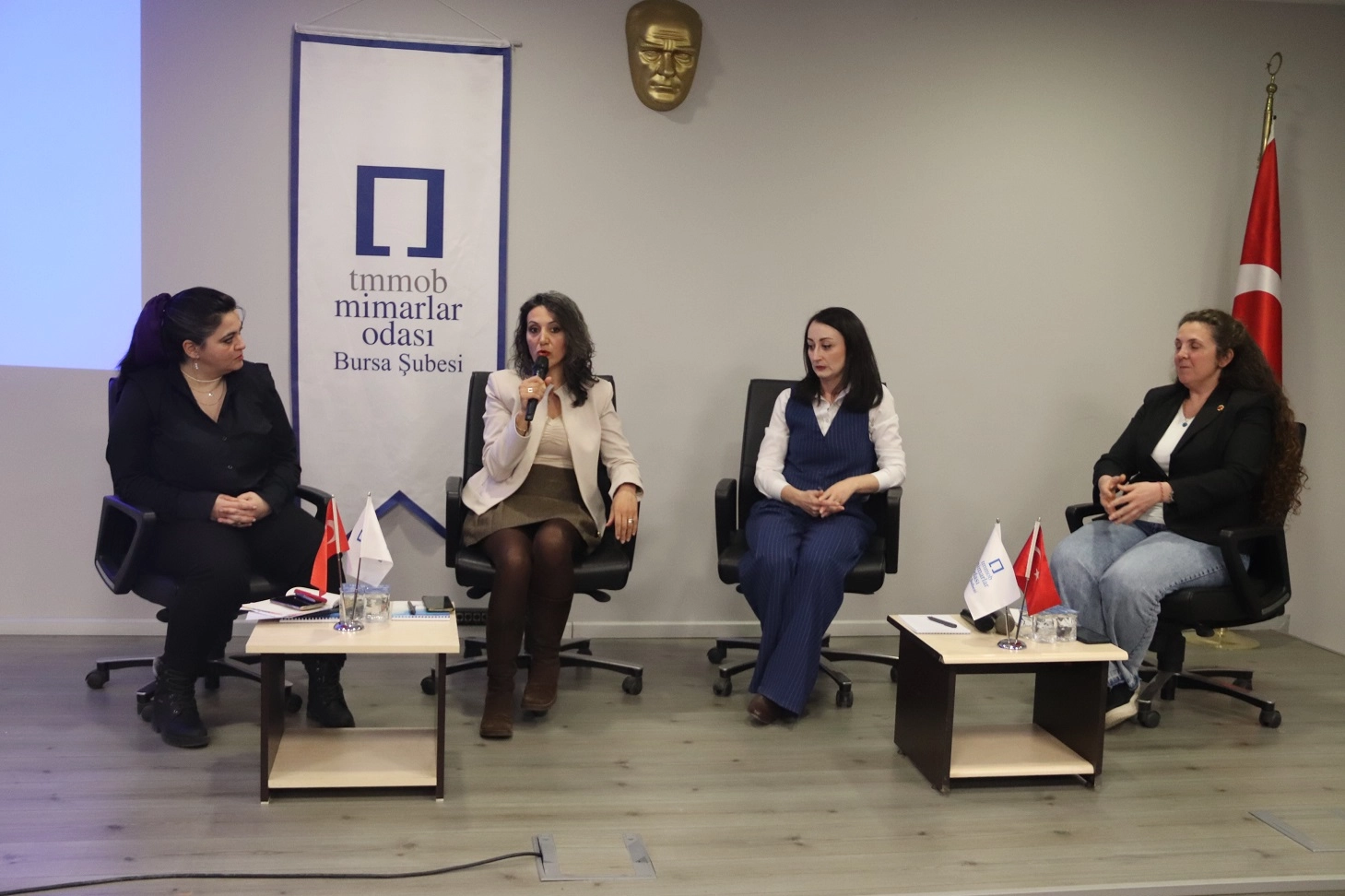 BAOB Yerleşkesi Mimarlar Odası Bursa Şubesi konferans salonunda Bursa Osmangazi Kent Konseyi Kadın Meclisi Başkanı Mimar Sevgi Baysal'ın moderatörlüğünde gerçekleşen etkinlikte, Nilüfer Belediyesi Meclis Üyesi Mimar Hafize Usturalı, Karacabey Belediyesi Meclis Üyesi Mimar Gizem Arda ve Bilecik Belediyesi Meclis Üyesi İmar Komisyonu Başkanı Mimar Didem Mean konuşmacı olarak yer aldı.