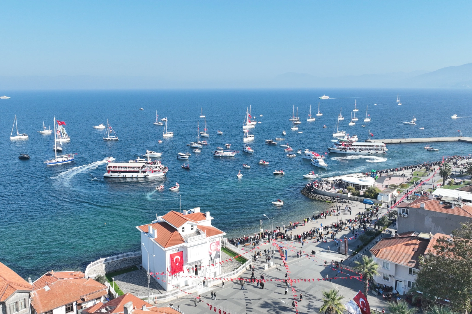 Mudanya'da 29 Ekim Cumhuriyet Bayramı coşkusu, denizde cumhuriyet tekneleri, sokaklarda vatandaşın coşkulu yürüyüşüyle doruğa ulaştı. Gündüz mavi sulara, akşam ise kırmızı beyaz renklere bürünen Mudanya, Cumhuriyet'in 101. yılını büyük bir coşkuyla kutladı.