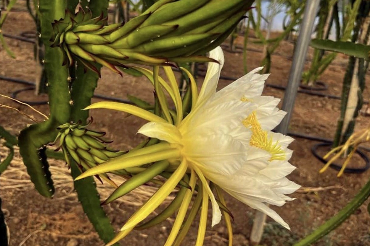 Balabancık Mahallesi Muhtar Ali Ceylan ve Mudanya İlçe Tarım ve Orman Müdürü Ergün Karadağ'ı tesislerinde ağırlayan üretici Yusuf Uçan, Mudanya'nın Balabancık Mahallesinde 1,5 dönüm arazi üzerine kurduğu sera tesislerinde ektiği ejder meyveleri 3 sene sonunda meyve vermeye hazırlanıyor.