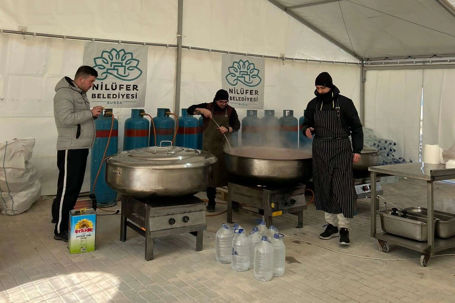 Büyük yıkımın yaşandığı Kahramanmaraş merkezli iki depremin ardından bütün Türkiye’de olduğu gibi Nilüfer’de de yapılan yardımlar her geçen gün ihtiyaçlara göre genişletilerek sürdürülüyor. Bölgeye şimdiye kadar 200’ü aşkın yardım malzemesi taşıyan tır gönderen Nilüfer Belediyesi, en acil ihtiyaç olan yemek konusunda da bir çalışma başlattı. Hafta sonunda Hatay’ın Samandağ ilçesinde aşevi kuruldu. 5 aşçı, 6 kurulum ekibi, kaynakçı, elektrikçi ve su tesisatçısıyla birlikte hizmet veren aşevinde sabahları sıcak çorba, öğlen ve akşamları da sıcak yemek dağıtımına başlandı. Atatürk Sahil Parkı’ndaki aşevine gelenlerden isteyenler yemeklerini orada yiyor, isteyenler de kaplarla evlerine götürebiliyor. Nilüfer Belediyesi Başkan Yardımcıları Zafer Yıldız ile Mehmet Temirtaş da aşevinin çalışmalarına katıldı.