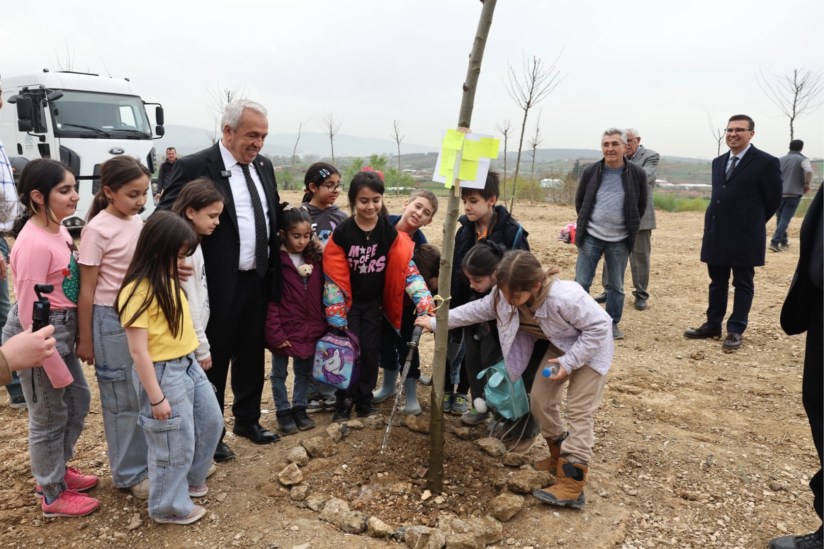 Nilüfer Belediye Başkanı Şadi Özdemir de alanda gruplar halinde ayrılan çocuklarla birlikte, çınar fidanlarını toprakla buluşturdu. Ardından Başkan Şadi Özdemir, çocuklarla fidanlara can suyunu verdi.