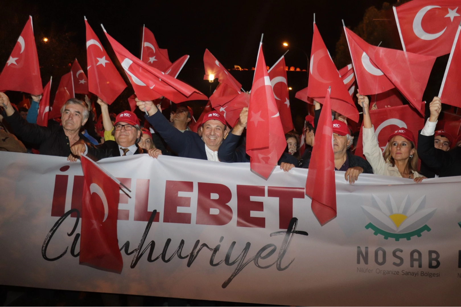 Türk Bayrakları eşliğinde NOSAB Atatürk Bulvarı’nda gerçekleştirilen Cumhuriyet Korteji’nin ardından etkinlik alanında bir konuşma yapan NOSAB Başkanı Erol Gülmez, Cumhuriyet’i meydanlarda kutlamak istediklerini ifade etti.
