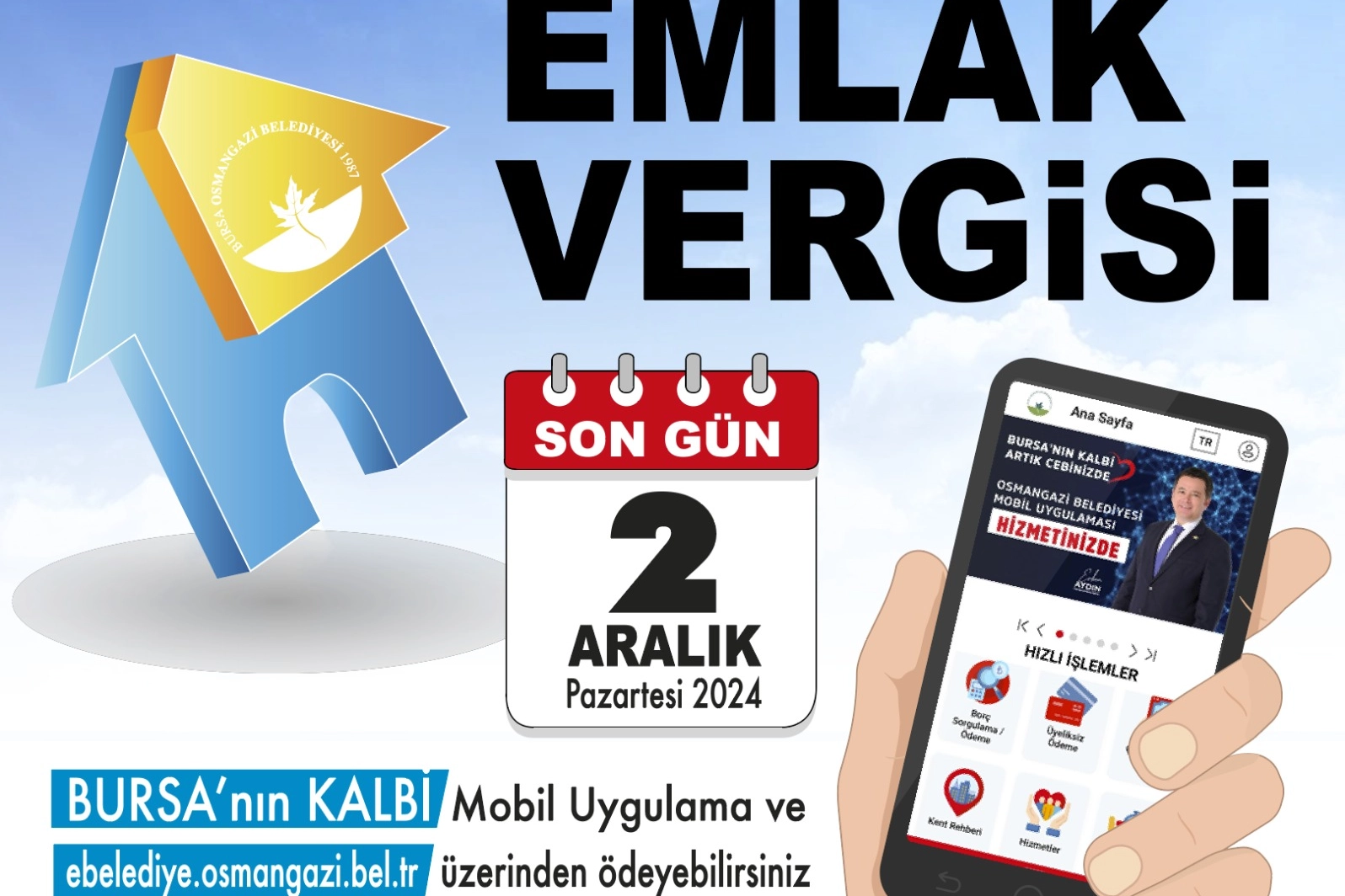Emlak Vergisi’nin 2. taksiti için ödeme süresi 2 Aralık’ta sona eriyor. Vergi ödemelerini gerçekleştirmek isteyen Osmangazililer, hafta içi 08.00-17.00 saatleri arasında TC kimlik numarası veya üye sicil numarası ile Osmangazi Belediyesi Ana Binası ile Emek, Nilüfer Köylü Pazarı ve Demirtaş’ta yer alan ödeme noktalarındaki veznelerde ödemelerini nakit veya kredi kartı ile gerçekleştirebilecek.