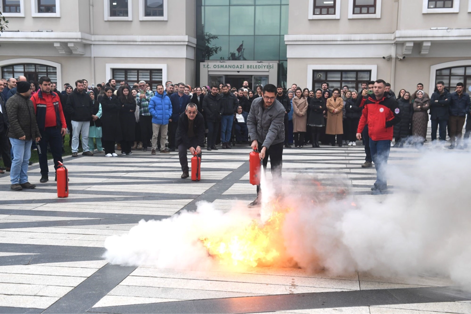 Afet İşleri Müdürlüğü personelinin yönlendirmesiyle Osmangazi Belediyesi merkez binası, 117 saniye gibi kısa sürede tümüyle tahliye edildi. Belediye binasının önünde toplanan personele Afet İşleri Müdürlüğü ekipleri, deprem ve yangın anında neler yapması gerektiğini uygulamalı olarak gösterdi. Ardından yakılan ateşe, doğru şekilde yangın söndürme tüpüyle nasıl müdahale edilmesi gerektiği anlatıldı.