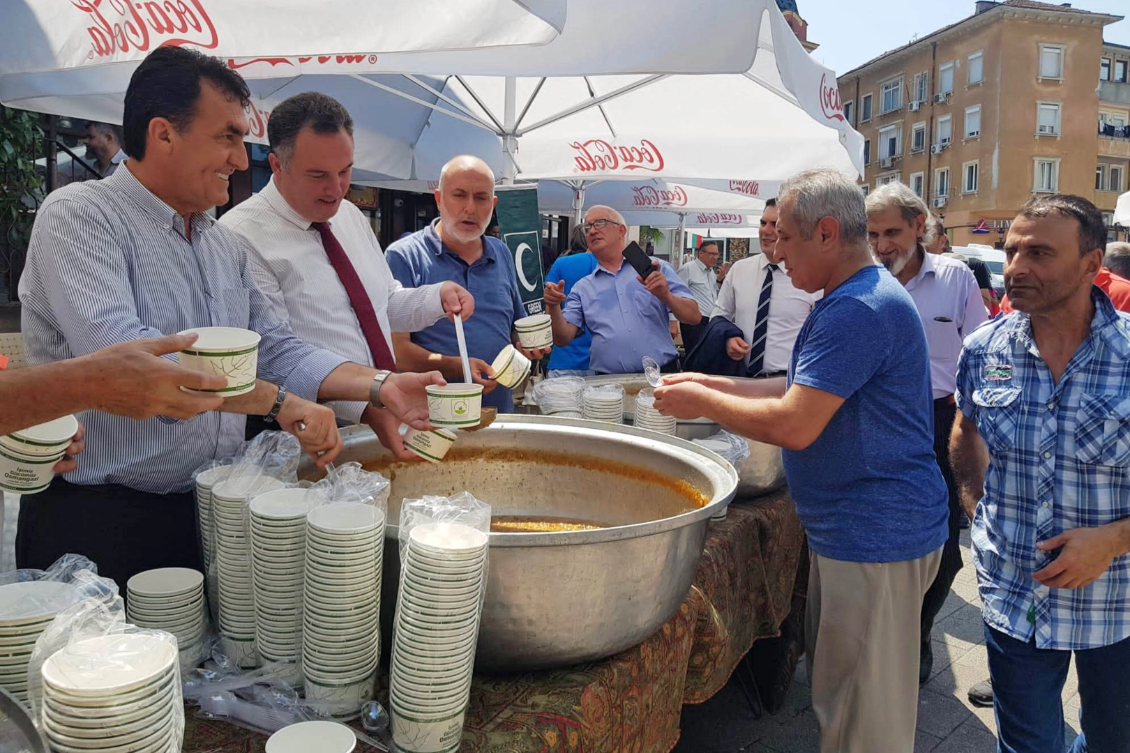 Başkan Dündar, sünnet şöleninin ardından Filibe Muradiye Camii’nde kılınan cuma namazının ardından aşure ikramında bulundu. Filibe Bölge Müftülüğü ve Muradiye Camii Başkanlığı işbirliğinde düzenlenen programda Başkan Dündar, Filibe Başkonsolosu Korhan Küngerü ile birlikte kazanların başına geçerek aşure dağıttı.