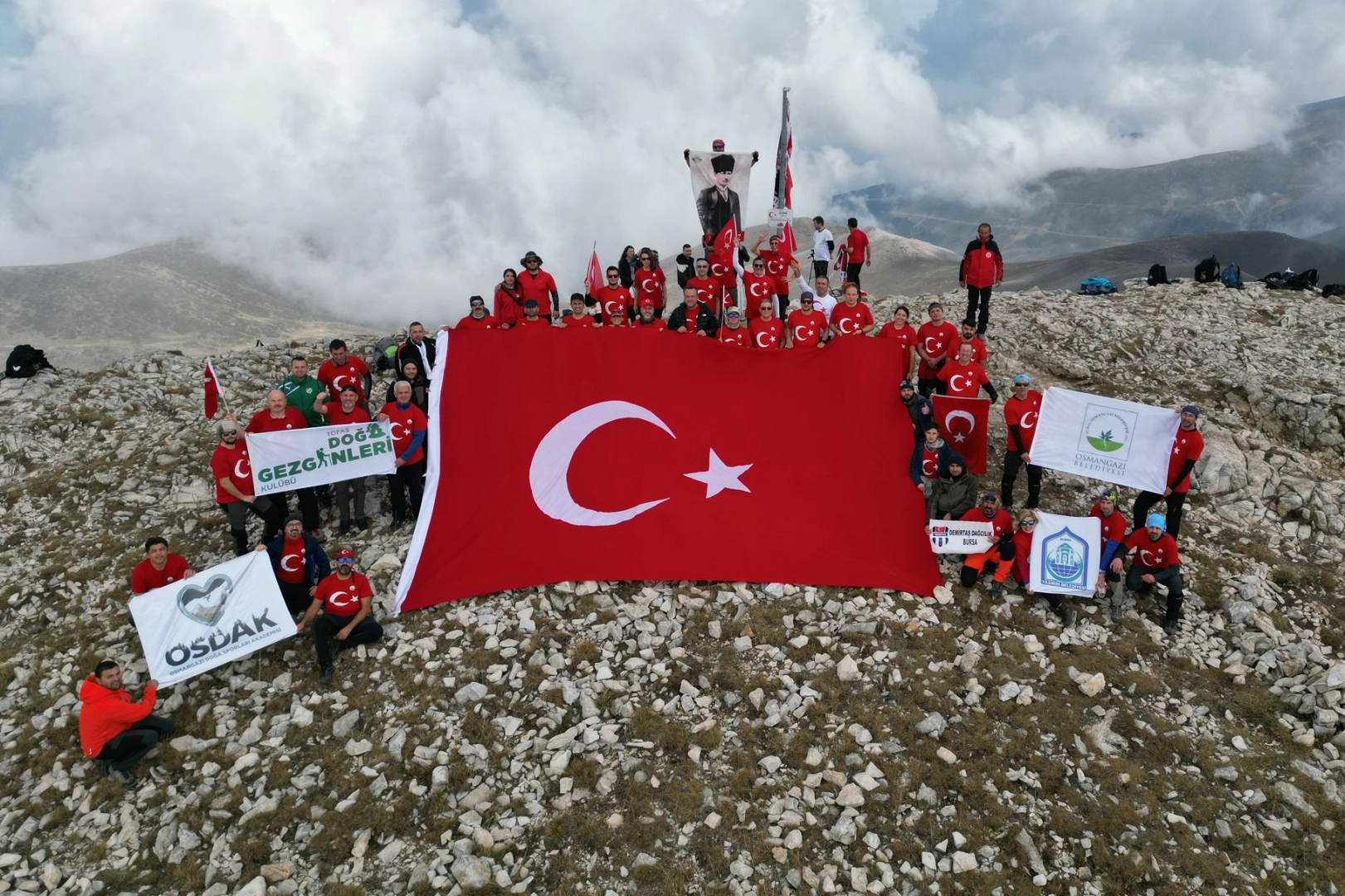 Türkiye Cumhuriyeti’nin 100’üncü yılını farklı alanda kutlamak için harekete geçen 49 doğasever, Uludağ oteller bölgesinde bir araya gelerek zirveye tırmanışı gerçekleştirdi. Oteller bölgesinden yürüyüşe geçen dağcılar, ilk önce 2 bin 486 metre rakımda bulunan küçük zirveye tırmandı. Buradan hareket ederek toplamda 4 saatlik yolculuğun ardından 2 bin 543 rakımlı büyük zirveye ulaştı. Dağcılar ulaştıkları büyük zirvede Türk Bayrağı açıp, İstiklal Marşı’nı okuyarak Cumhuriyetin 100’üncü yılını kutladı.