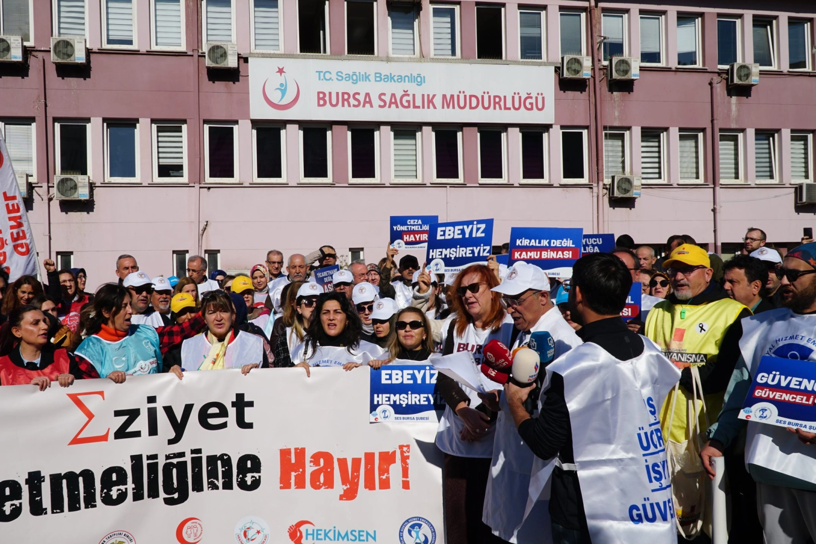 Bursa Tabip Odası (BTO), Genel Sağlık İş Sendikası, HEKİM SEN, Hekimler Birliği Sendikası, Sağlık ve Sosyal Hizmetler Emekçileri Sendikası Bursa Şubesi (SES), Bursa Aile Hekimleri Derneği (BURSAHED) ile Birlik ve Dayanışma Sendikası’nın çağrısıyla Bursa İl Sağlık Müdürlüğü önünde bir araya gelen sağlık çalışanları basın açıklaması gerçekleştirdi.