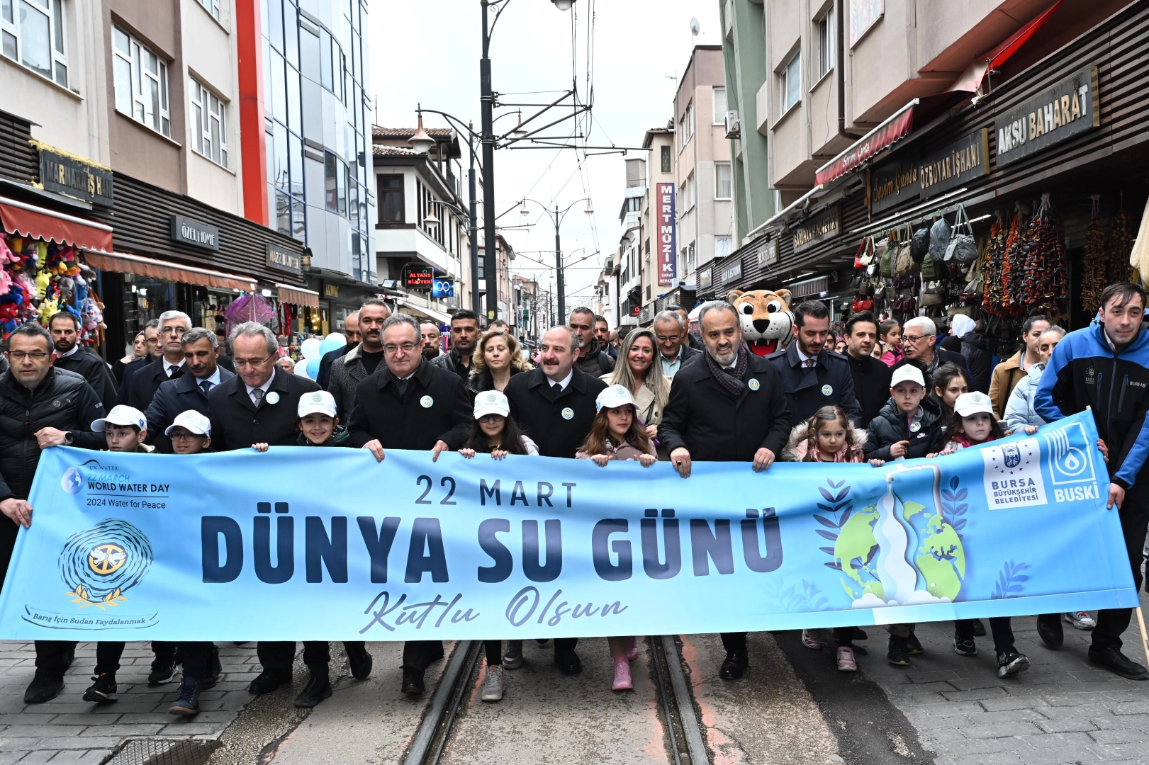Hayat kaynağı olan suyun doğru kullanımına dikkat çekmek amacıyla Bursa Büyükşehir Belediyesi ve BUSKİ Genel Müdürlüğü tarafından 22 Mart Dünya Su Günü etkinlikleri kapsamında kortej yürüyüşü düzenlendi. Cumhuriyet Caddesi’nde başlayan yürüyüşe Bursa Büyükşehir Belediye Başkanı Alinur Aktaş, Bursa Milletvekili Mustafa Varank, İl Milli Eğitim Müdürü Ahmet Alireisoğlu, kamu kurumları temsilcileri, Bursalı vatandaşlar ve yüzlerce çocuk katıldı. Büyükşehir Belediye Bandosu eşliğinde gerçekleşen yürüyüşte, çeşitli okullardan gelen öğrenciler ellerindeki pankartlarla suyun tasarruflu kullanımına dikkat çekti.
