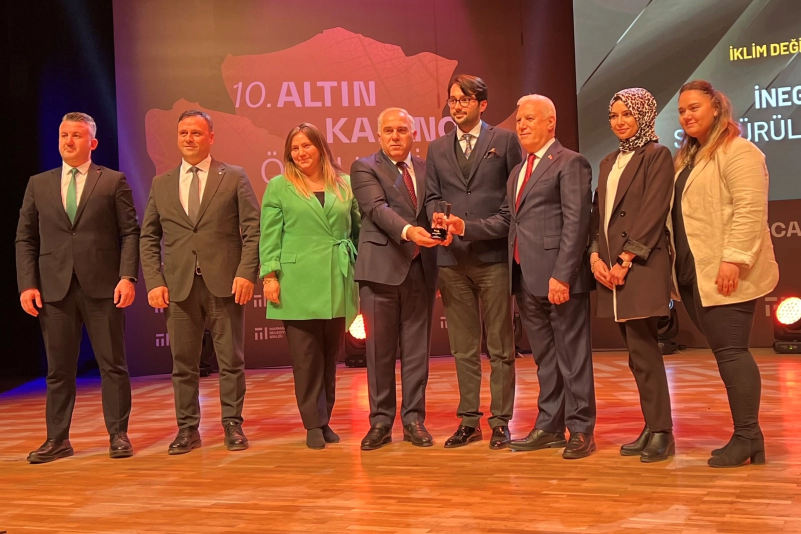 Marmara Belediyeler Birliği (MBB) tarafından düzenlenen ve belediyelerin ilham veren projelerinin değerlendirildiği Altın Karınca Ödülleri Perşembe günü İstanbul’da gerçekleşen törenle 10’uncu kez sahiplerini buldu. İklim değişikliğinden kültür sanata, ulaşımdan afet yönetimine 10 ayrı kategoride 55 proje ödüle layık görüldü. Bu yıl 310 projenin başvurduğu ve 21 kişilik jüri tarafından projelerin detaylı şekilde incelendiği Altın Karınca Ödüllerinde, İnegöl Belediyesi de “Sürdürülebilir Hava Kalitesi Ölçüm Ağı” projesi ile “İklim Değişikliği ve Çevre Yönetimi” kategorisinde ödüle layık görüldü.