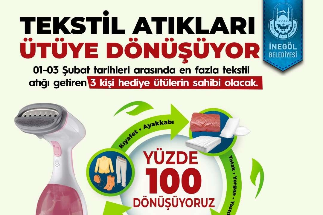 İnegöl Belediyesi’nden yapılan açıklamada, Temizlik İşleri Müdürlüğü ile Basın Yayın ve Halkla İlişkiler Müdürlüğü iş birliğinde “Tekstil atıkları ütüye dönüşüyor” sloganıyla yeni bir kampanyanın başlayacağı duyuruldu. 01-03 Şubat tarihleri arasında en fazla tekstil atığı getiren 3 kişiye dikey ütü hediye edilecek. Kıyafet, ayakkabı, yatak, yorgan, yastık, halı, kilim, perde vb tüm tekstil atıklarını kapsayan kampanyada, atıklar İnegöl Belediyesi merkez binada bulunan Basın Yayın ve Halkla İlişkiler Müdürlüğüne getirilerek burada toplanacak. Yata, yorgan gibi büyük ve taşınmayacak ölçüde olan atıklar için de vatandaşlar 153 Çözüm Merkezini arayarak atıkların alınmasını talep edebilecek. Tekstil atıkları 01-03 Şubat tarihleri arasında toplanacak. Yüzde 100 Dönüşüyoruz sloganıyla hayat bulan kampanya ile tekstil atıklarının ve kullanılmayan eşyaların yeniden kullanıma kazandırılması, geri dönüşümünün sağlanması hedefleniyor.