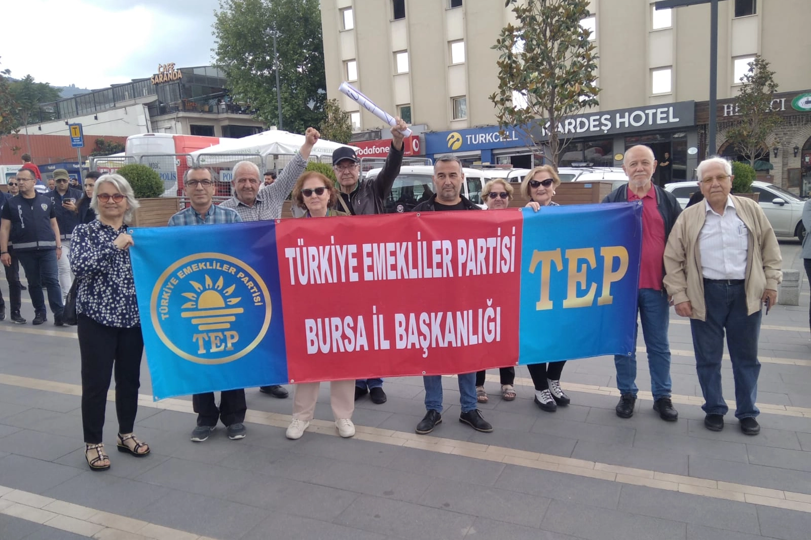 TEP Genel Başkanı Oktay Akcin, MKYK Üyesi Yılmaz Alpyürür, Bursa İl Yönetim Kurulu Üyeleri Vildan Alpyürür, Ülfet Hayman, Bursa Osmangazi İlçe Başkanı Müberra Özdemir, Osmangazi İlçe Yönetim Kurulu Üyeleri Hasan Yaşar ve Murat Ozan’ın da katıldığı mitingde emekliler, Mutfakta yangın var, bıçak kemiğe dayandı", "Krizin bedelini biz ödemeyeceğiz" yazılı pankartlar ve dövizler taşıyarak taleplerini iletti.