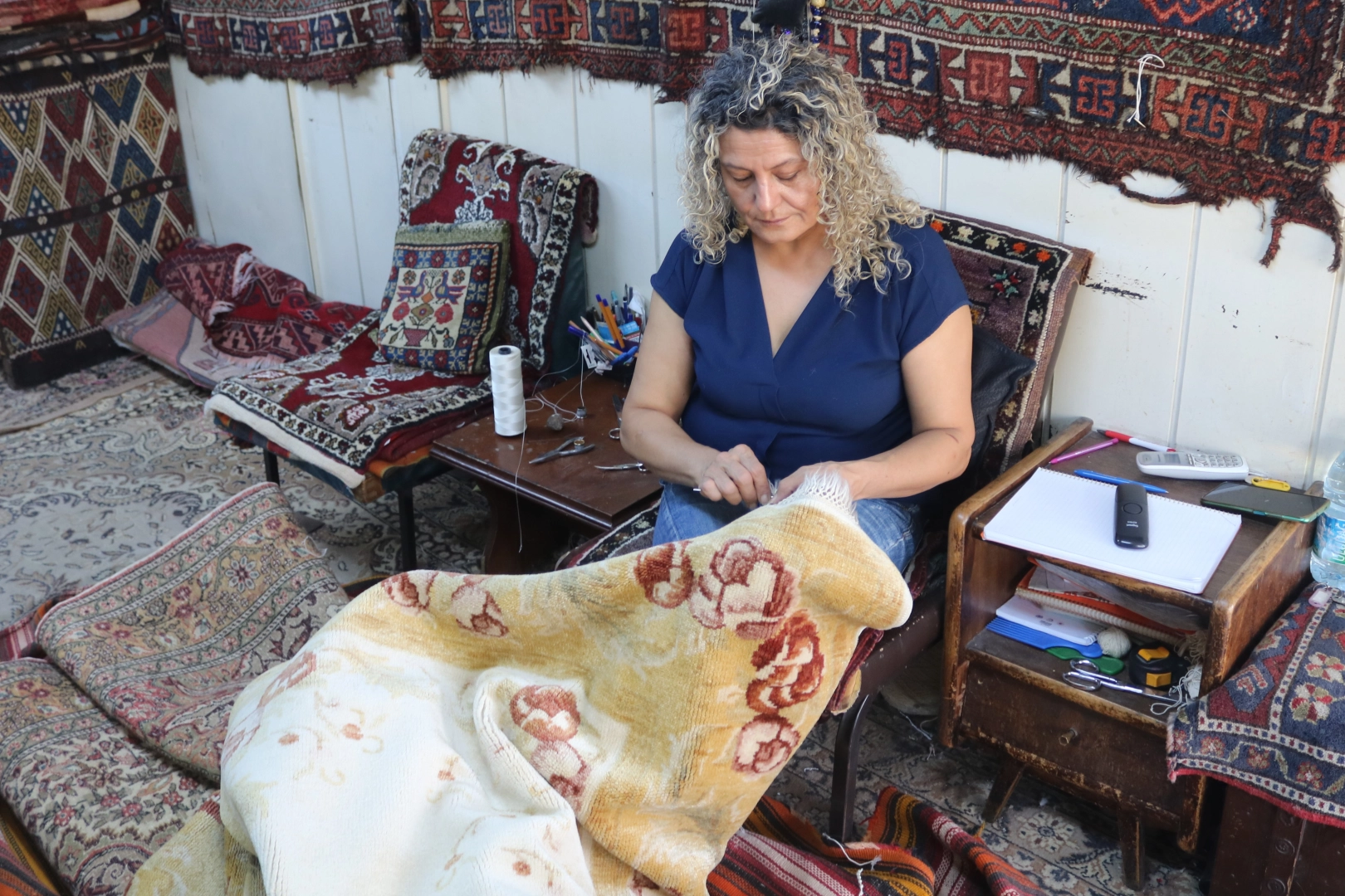 Bursalı İlknur Temel (53) ev hanımıyken eşine yardım için başladığı halı tamirciliğinde usta oldu. 32 yıldır halı tamirciliği yapan Temel, yurt içi ve yurt dışından gelen antika halıları el işçiliği ile tamir ederek sahiplerine teslim ediyor. Halı tamirinin el işçiliği ile yapılmasından dolayı uzun sürdüğünü söyleyen Temel, günde 18 saat çalıştığını belirterek, yoğunluk olduğu zamanlar bazen eve de iş götürdüğünü ifade etti. Ayrıca antika halı merakı olduğunu ve evinde 70 ila 80 halıdan oluşan halı koleksiyonu bulunduğunu söyleyen Temel, “Hepsini ayrı ayrı seviyorum, kullanıyorum. Bazen 10 tane üst üste serip basıyorum” dedi.