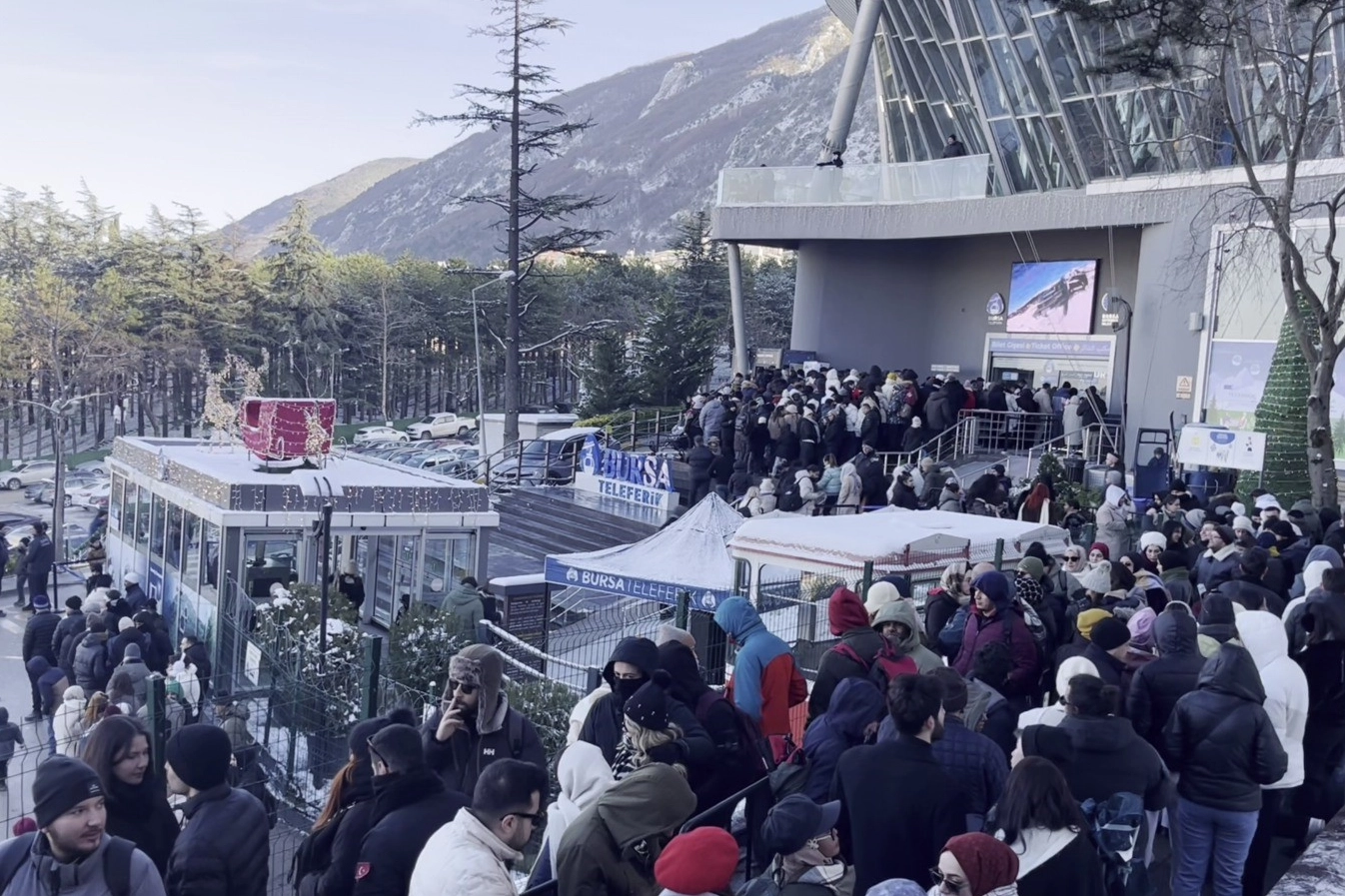 Uludağ'da kış turizmi yoğunluğu nedeniyle teleferik istasyonlarında uzun kuyruklar oluştu. Güvenlik nedeniyle sınırlı yolcu alınması bekleme süresini uzatırken, bazı tatilciler özel araçlarını tercih etti. Kar kalınlığı 60 cm, hava -5°C.