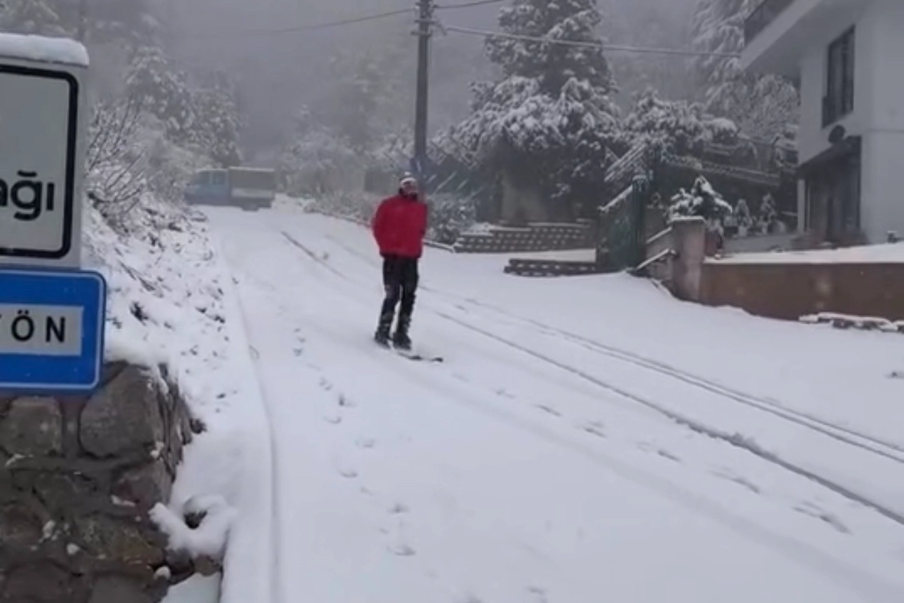 Bursa'da şehir merkezine yağan karı fırsata çeviren bir kişi, kayak takımıyla yokuş aşağı kayarak renkli görüntüler oluşturdu. Merkez Yıldırım ilçesi Piremir Mahallesi'nde sabah saatlerinde etkili olan kar yağışı sonrası beyaza bürünen yollarda kayak takımıyla kayan vatandaş, çevredeki vatandaşların ilgisini çekti. O anlar cep telefonu kamerasıyla kaydedildi.