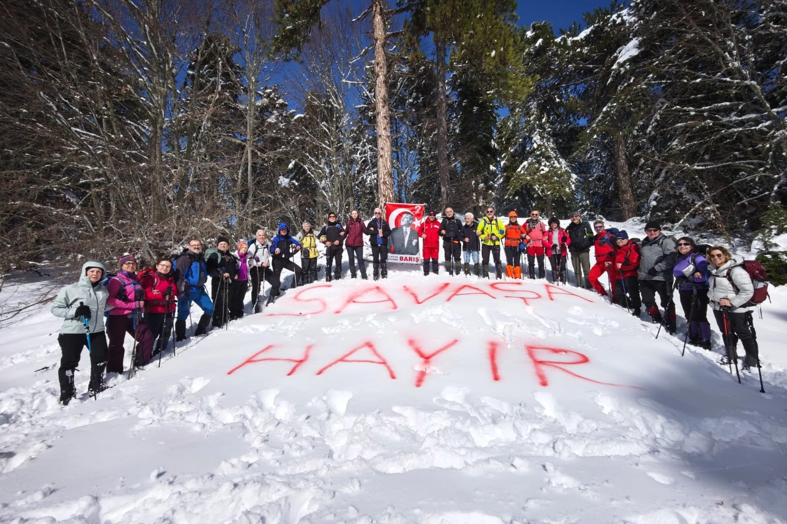 Sınır Tanımayan Dağcılar Spor Kulübü, yaşanan savaşlara dikkat çekmek için Uludağ'da anlamlı bir harekete imza attı. Sınır Tanımayan Dağcılar Spor Kulübü, Uludağ’ın Dolubaba mevkiinden başlayarak Karabelen "Milli Park girişi" hattı üzerinden Süleymaniye bölgesine uzanan orta zorlukta 11 kilometrelik kış yürüyüşü gerçekleştirdi. Etkinlik, hem sportif yönü hem de toplumsal duyarlılık mesajlarıyla dikkat çekti. Kulüp üyeleri ve çok sayıda doğasever, güneşli ve açık havada gerçekleştirilen yürüyüşte 30-40 santimetreyi bulan kar kalınlığına rağmen parkuru disiplinli bir şekilde tamamladı. Başkan Ali Yavuz Kaya, yürüyüş sonrası yaptığı değerlendirmede, doğa sporlarının sadece fiziksel bir aktivite olmadığını vurgulayarak şu ifadeleri kullandı: "Dağcılık sabrı, disiplini ve kardeşliği öğretir. Bizler zirveye ve doğada yürürken aynı zamanda toplumsal sorumluluğumuzu da hatırlıyoruz. Dağcıların toplumsal işleyişimizdeki önemi ve dayanışma duygusu var" dedi. Kulüp üyeleri ve katılımcılar, dünyada yaşanan savaş ve çatışmalara dikkat çekmek amacıyla anlamlı bir mesaj verdi. Beyaz kar örtüsü üzerine büyük harflerle 'Savaşa hayır' yazan doğaseverler, sporun barışçıl ve birleştirici gücünü bir kez daha ortaya koydu.