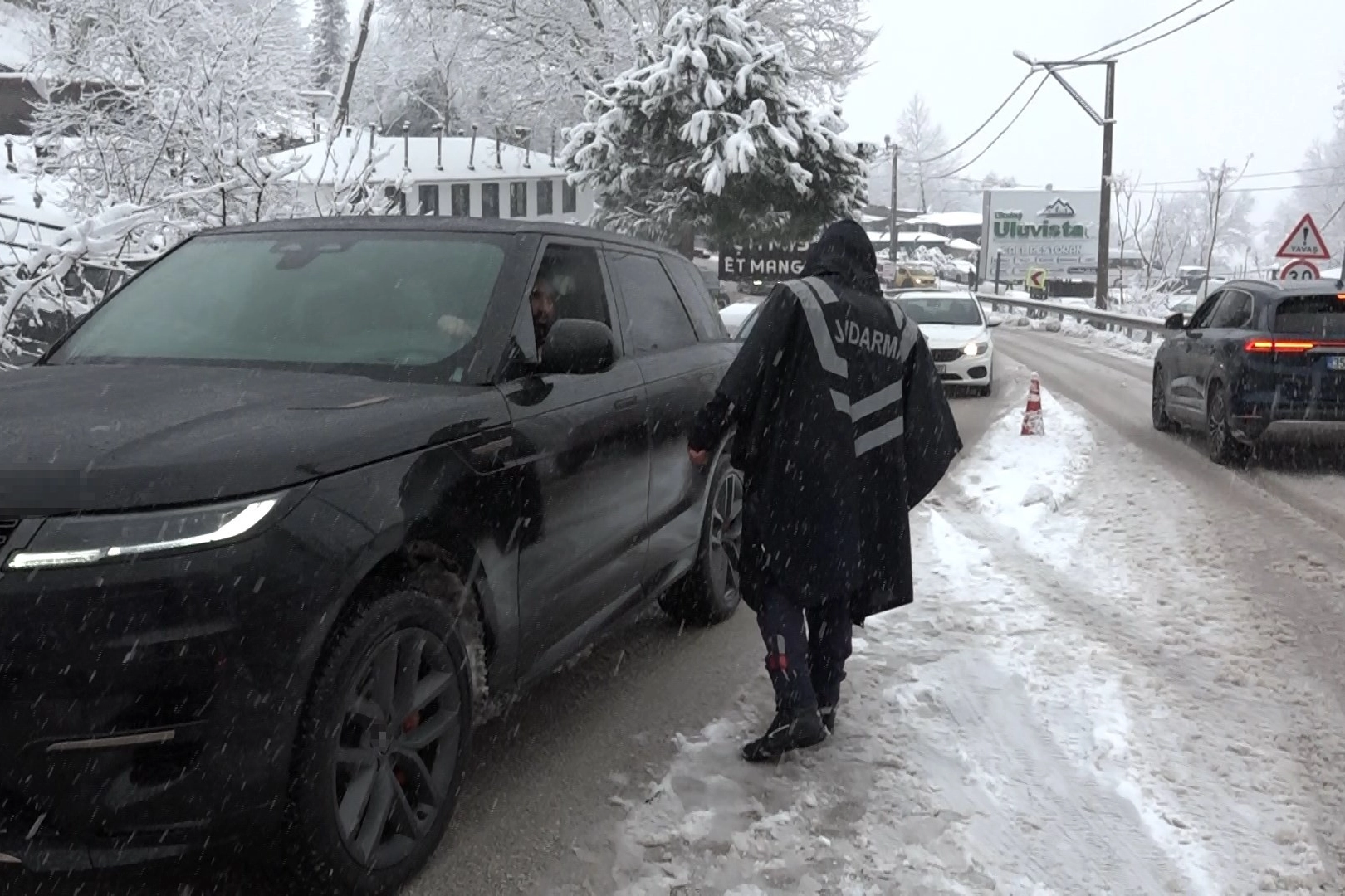 Bursa'da sabah saatlerinde etkili olan yoğun kar yağışıyla birlikte Uludağ yolunda jandarma ekipleri zirveye çıkmak isteyen araçları tek tek durdurdu. 8. kilometrede ekipler zincirsiz olan sürücülerin zirveye çıkmasına izin vermedi. Meteorolojinin uyarılarının ardından beklenen soğuk hava etkisini gösterdi.