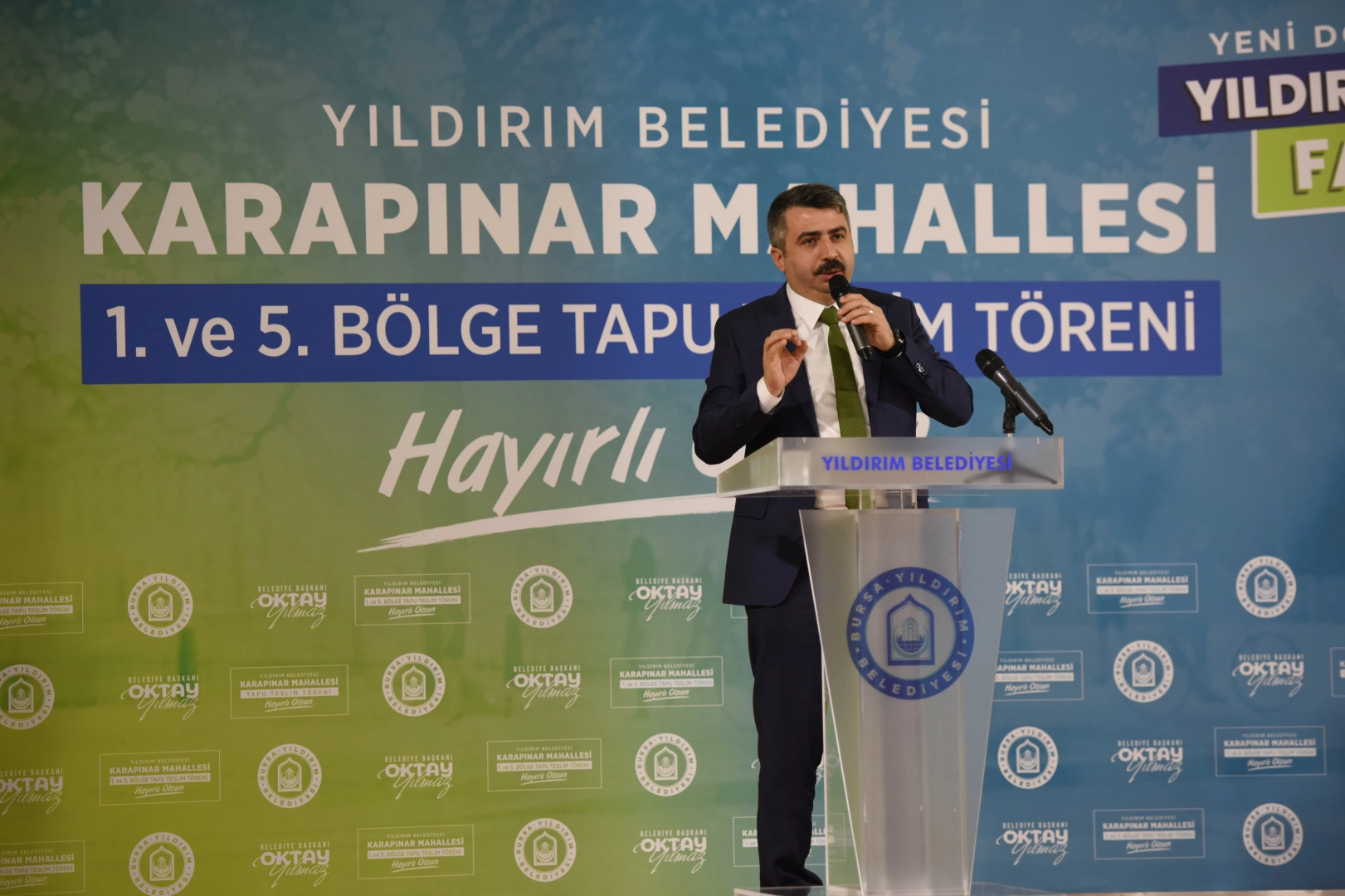 Törende konuşan Yıldırım Belediye Başkanı Oktay Yılmaz, Yıldırım’ın Türkiye’deki 50 şehirden daha büyük bir ilçe olduğunu hatırlatarak, 5 yıldır çocukları, gençleri, kadınları, yaşlıları ile Yıldırımlıların mutluluğu ve huzuru için çalışmaya devam edeceklerini vurguladı. Geride kalan 5 yıllık süreçte imar uygulamalarından kentsel dönüşüme, yeşil alanlardan parklara, spor tesislerinden kütüphanelere, modern pazar alanlarından meydanlara kadar birçok önemli hizmetleri Yıldırım’a kazandırmanın gururunu yaşadıklarını belirten Başkan Yılmaz, “Tüm bunları yaparken temel önceliğimiz ise Yıldırım’ın en önemli problemi olan imar, hisseli parsel ve mülkiyet sorununu çözmek oldu. Bu doğrultuda önemli adımlar atarak Türkiye’nin önünü açacak bir kanun düzenlemesine öncülük ettik. Akabinde başlattığımız imar uygulamalarıyla kısa sürede 10 bin hak sahibine tapularını teslim ettik. Kısa süre içerisinde bu sayı 40 bine ulaşacak” dedi.