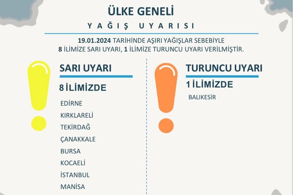İçişleri Bakanı Ali Yerlikaya, X hesabından yaptığı paylaşımda, yarın aşırı yağışlar nedeniyle Balıkesir’de turuncu kodlu uyarıda bulunurken, Edirne, Kırklareli, Tekirdağ, Çanakkale, Bursa, Kocaeli, İstanbul ve Manisa ise sarı kodlu uyarıda bulundu. Yerlikaya paylaşımda, aşırı yağışlar nedeniyle meydana gelebilecek sel, su baskını ve heyelan gibi olumsuzlara karşı vatandaşların tedbiri elden bırakmaması gerektiğine dikkati çekti.