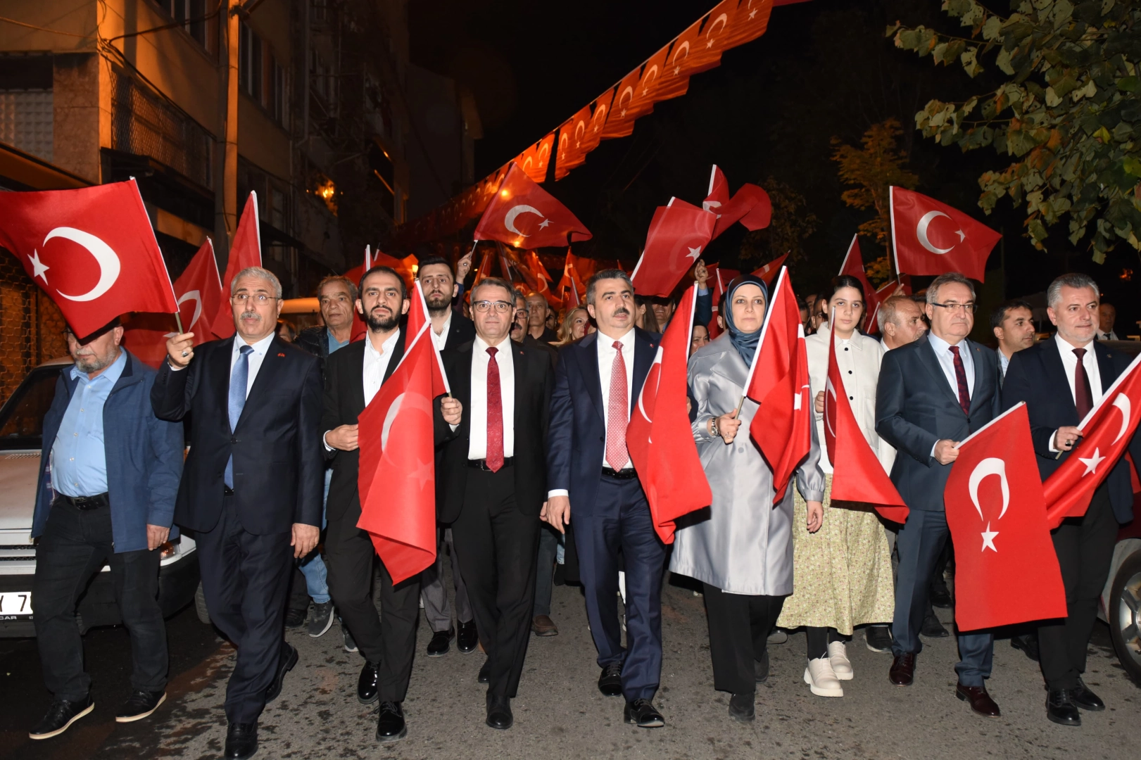 Türkiye Cumhuriyeti’nin kuruluşunun 101’inci yıl dönümü, Yıldırım’da büyük bir coşkuyla kutlandı. Kurtuluş Caddesi esnaf ziyareti ve bayrak dağıtımı ile başlayan kutlamalar kapsamında Karaağaç Mahallesi’nden Ahmet Taner Kışlalı Meydanı’na kadar klasik, modifiye ve yerli otomobilimiz TOGG araçları ve motor konvoyu düzenlenirken, Türk bayraklarıyla mehter ve kılıç kalkan eşliğinde yapılan yürüyüş, bayram coşkusunu ikiye katladı. Ahmet Taner Kışlalı Meydanı’nda düzenlenen program Prusa Sanat Halk Dansları Gösterisi ile başladı. Sevilen sanatçı Elif Buse Doğan birbirinden güzel şarkılarıyla Yıldırımlılara unutulmayacak bir bayram yaşattı. Binlerce insanın bir araya geldiği Cumhuriyet Bayramı etkinlikleri ilçe sakinlerinden tam not aldı. Programa, Yıldırım Belediye Başkanı Oktay Yılmaz’ın yanı sıra Yıldırım İlçe Kaymakamı Metin Esen, AK Parti İl Başkan Yardımcısı Ufuk Ay, Milliyetçi Hareket Partisi İl Başkan Yardımcısı Hikmet Çalışye, AK Parti Yıldırım İlçe Başkanı İrfan Akkaya, MHP Yıldırım İlçe Başkanı Kadir Taşçı, İlçe Milli Eğitim Müdürü Mustafa Sevinç, meclis üyeleri, muhtarlar ve vatandaşlar katıldı.