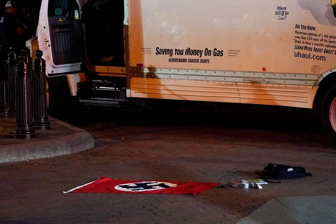 Kamyonette bir Nazi bayrağı bulunurken, şüphelinin kimliği ve neden böyle bir eyleme kalkıştığına ilişkin bilgi verilmedi.