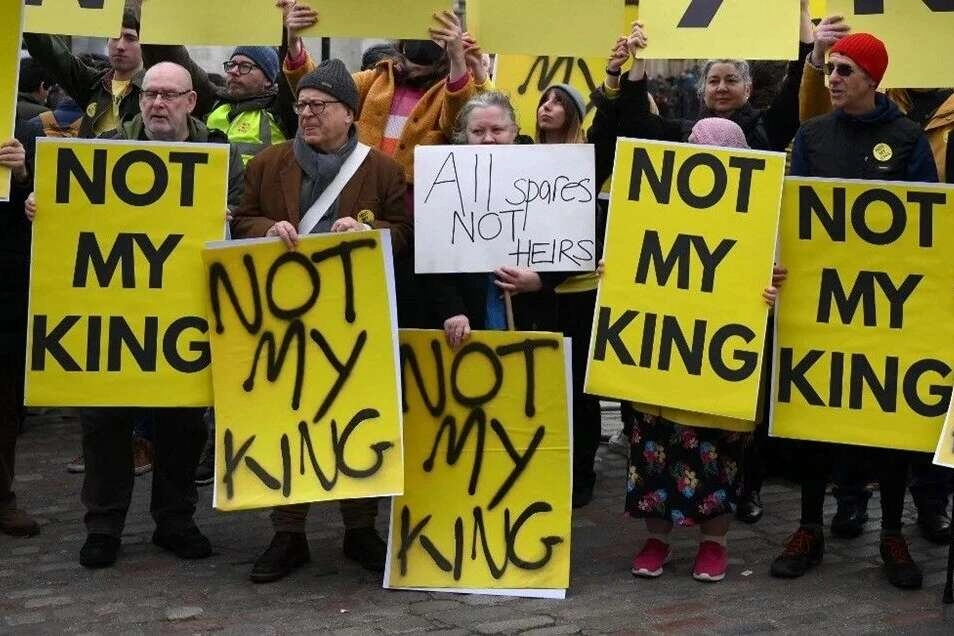 Monarşi karşıtları, ellerinde "Benim kralım değilsin", "ırkçı kraliyet ailesi" yazan pankartlar taşıdı.