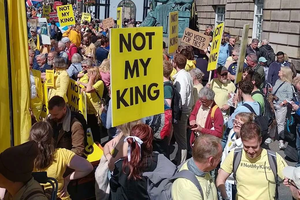 Kral Charles, başkenti Edinburgh’taki St. Giles Katedrali'ne gittiği sırada yol kenarında toplanan ve ellerinde “Benim kralım değil” yazılı dövizler taşıyan monarşi karşıtları tarafından protesto edildi. Monarşi karşıtları sık sık “Benim kralım değil” sloganı atarken, protestolar sırasında güvenlik bariyerini aşmaya çalıştıkları iddiasıyla 2 gösterici ise gözaltına alındı.