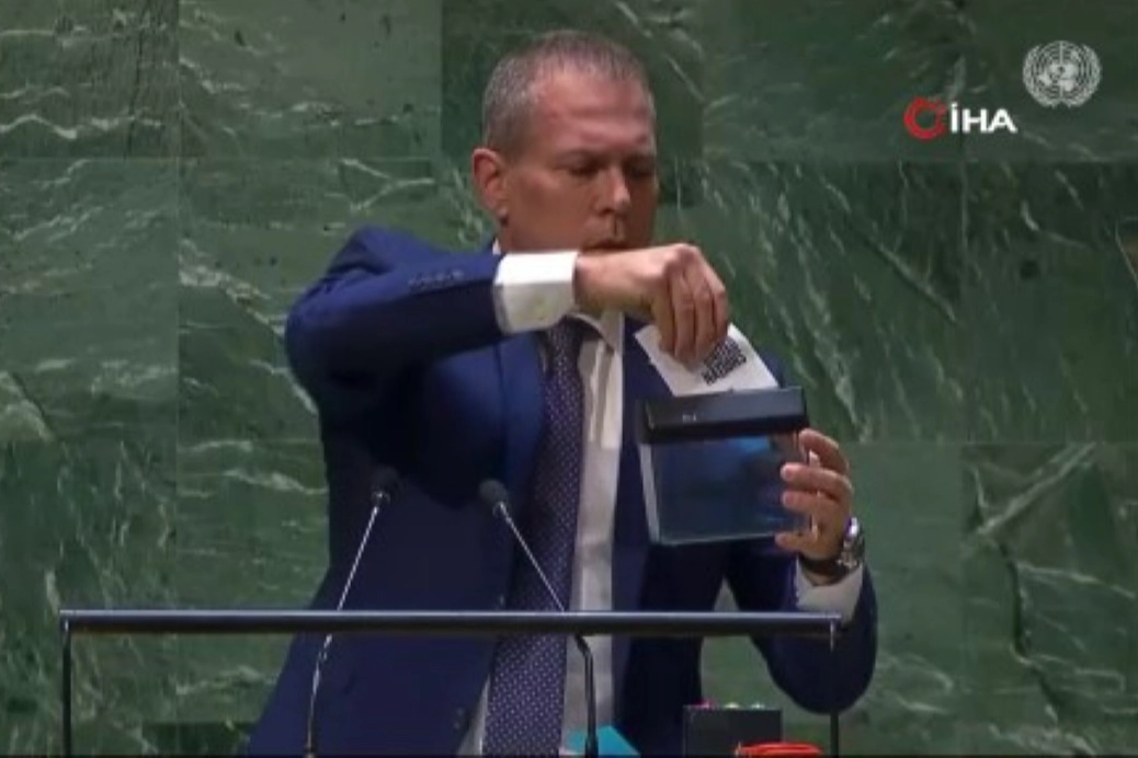 BM Genel Kurulunda dün görüşülen, BM'de "gözlemci" statüsünde olan Filistin'e bazı haklar tanınması ve Filistin'in BM üyeliğinin BM Güvenlik Konseyi'nde tekrar görüşülmesi talep edilen karar tasarısı, İsrail'de rahatsızlığa yol açtı. İsrail'in BM Daimi Temsilcisi Gilad Erdan, Genel Kurul'da düzenlenen oturumda yaptığı konuşmada, Filistin'in örgüte üyeliğini destekleyen ülkelere tepki gösterdi. Erdan üyeliği destekleyen ülkeleri işaret edip, "BM Şartı'nı kendi ellerinizle parçalıyorsunuz" diyerek BM'nin kuruluş anlaşması belgesinin kopyasını yanında getirdiği kağıt öğütücüye koyarak parçaladı. İsrailli diplomatın skandal eylemi sosyal medyada kısa sürede gündem oldu. Tarihi Filistin kararı