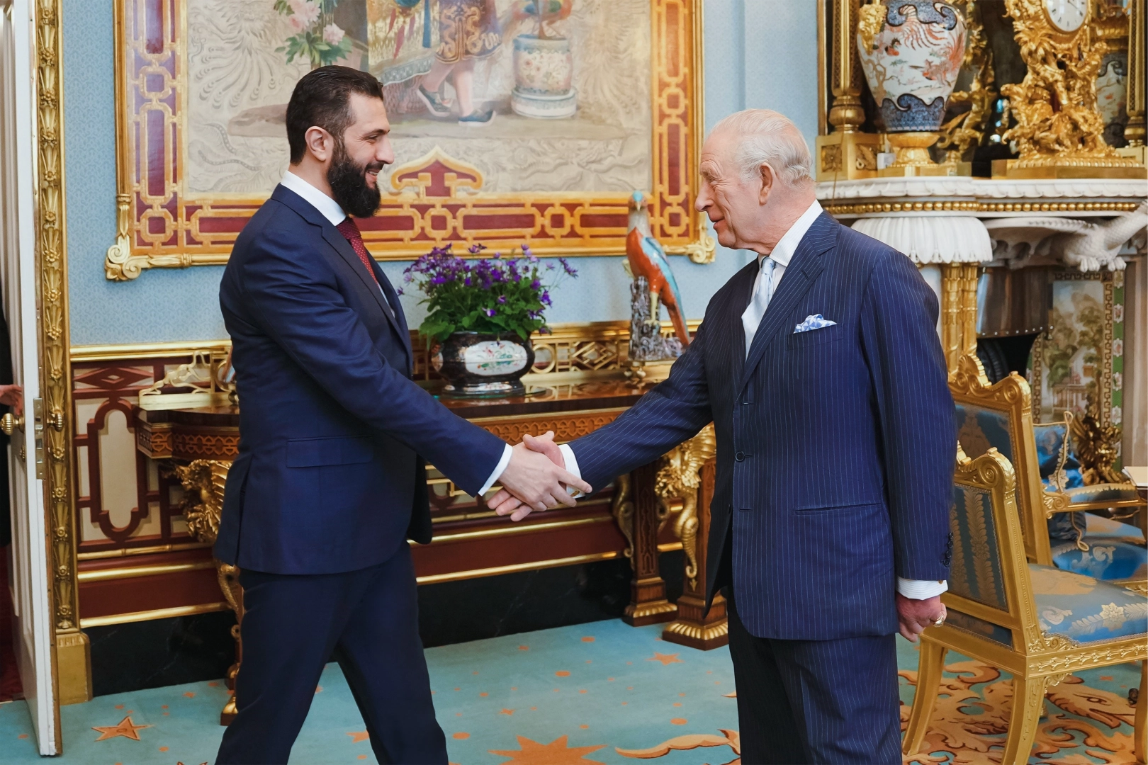 Suriye Devlet Başkanı Ahmed eş-Şara, İngiltere'ye gerçekleştirdiği ilk resmi ziyaret kapsamında İngiltere Kralı III. Charles ile bir araya geldi. Suriye Devlet Başkanı Ahmed eş-Şara, İngiltere'ye gerçekleştirdiği ilk resmi ziyaretinde temaslarına devam ediyor. Eş-Şara, başkent Londra’da bulunan Buckingham Sarayı’nda Kral III. Charles ile bir araya geldi. Görüşmede, iki ülke arasındaki işbirliğinin ortak çıkarlar temelinde geliştirilmesine yönelik imkanlar ele alındı. Kral Charles, görüşmede, Suriye’ye ve halkına ülkelerini yeniden inşa etme çabalarına desteğini ifade etti. İNGİLİZ İŞ DÜNYASI İLE BİR ARAYA GELDİ Eş-Şara, temasları kapsamında ayrıca beraberindeki heyetle birlikte üst düzey İngiliz yetkililerin yanı sıra iş dünyası temsilcileriyle de bir dizi görüşme gerçekleştirdi. İngiliz şirket yetkilileri ve iş insanları ile ikili ilişkilerin güçlendirilmesi, kalkınma ve yatırım alanlarında işbirliğinin artırılması konuları görüşüldü.