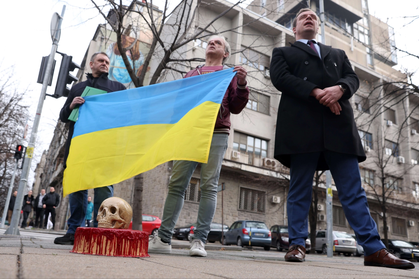 Rusya-Ukrayna savaşının birinci yıl dönümünde Avrupa'da eylemler gerçekleştiriliyor. Sırbistan'ın başkenti Belgrad'da Ukrayna yanlısı aktivistler, Rus Büyükelçiliğinin önüne üzerinde kanı simgeleyen kırmızı boya ve kuru kafa maketi bulunan “ölüm pastası” getirdi. Bölgede güvenlik önlemi alan polis, aktivistlerin pastayı elçilik önüne bırakmasına izin vermedi. Bunun üzerine aktivistler, pastayı büyükelçiliğe yakın bir yere bıraktı.