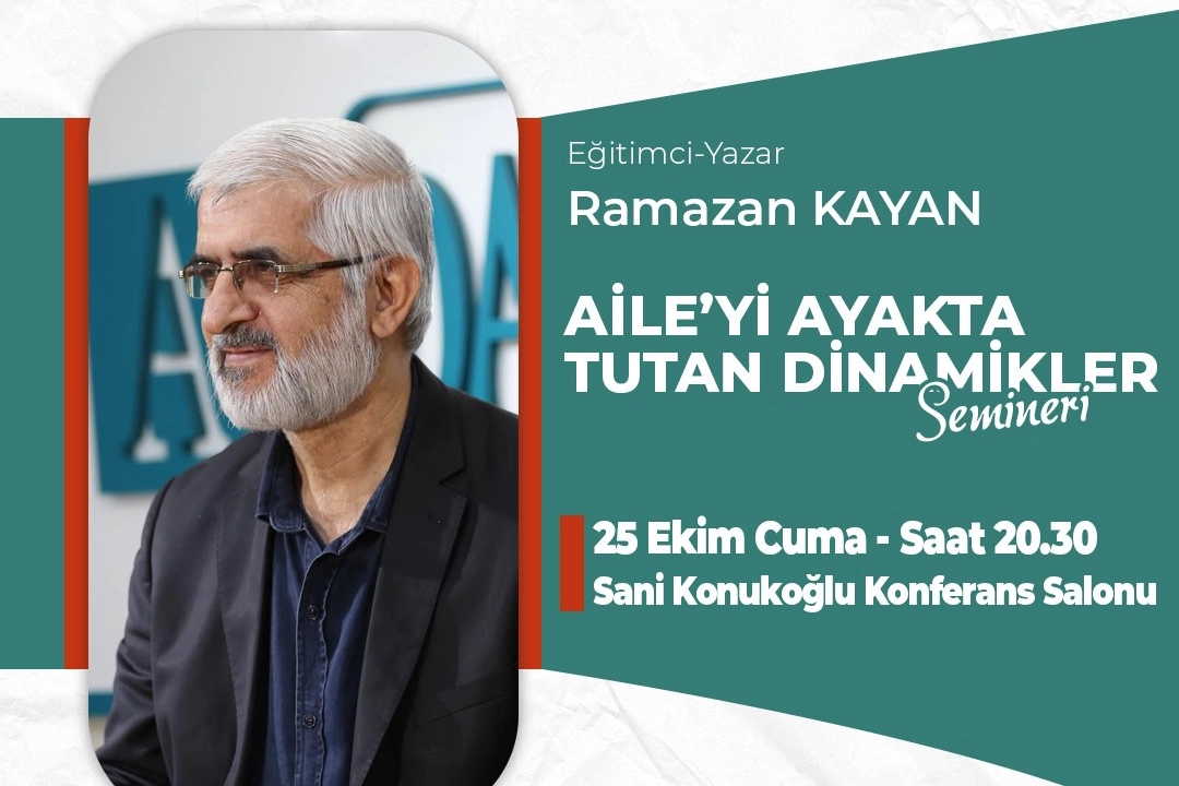 Aile Okulunun bu haftaki konuğu Eğitimci Yazar Ramazan Kayan olacak. 25 Ekim Cuma akşamı 20.30’da Sani Konukoğlu Konferans Salonunda İnegöllülerle buluşacak Kayan, “Aileyi Ayakta Tutan Dinamikler” konulu seminerde anlatımlarda bulunacak.