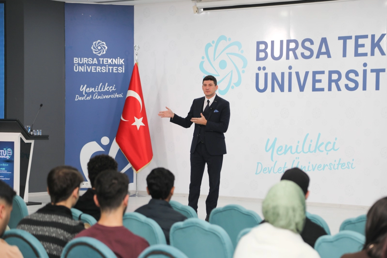 Öğrencileri her çarşamba günü alanında uzman isimlerle bir araya getirerek, tecrübe paylaşımı sağlayan BTÜ Konuşmaları’nın 3’ncü sezonda 23’ncü bölüm konuğu Anadolu Aslanları İş Adamları Derneği (ASKON) Bursa Şube Başkanı ve Dış Ekonomik İlişkiler Kurulu (DEİK), Türkiye-İrlanda İş Konseyi Başkanı Emre Yıldız oldu. “Gelecek ve Kariyer Kaygısı Üzerine” başlıklı sunumunu gerçekleştiren Emre Yıldız, iş hayatında tırmandığı kariyer basamaklarından ve ilke edindiği değerlerden söz etti. Kariyerde başarının ilk aşamasının sürdürülebilirlik olduğunu ifade eden Emre Yıldız, “Kendinize ne kadar fazla donanım eklerseniz hayat size o kadar imkân sağlıyor. Kariyer başlangıcında ‘yapamazsın, tecrübesizsin’ gibi kelimeleri çok duyacaksınız. Ama kendinize hedef edindiğiniz noktaya emin adımlarla yürüdükten sonra başarı beraberinde geliyor” dedi.