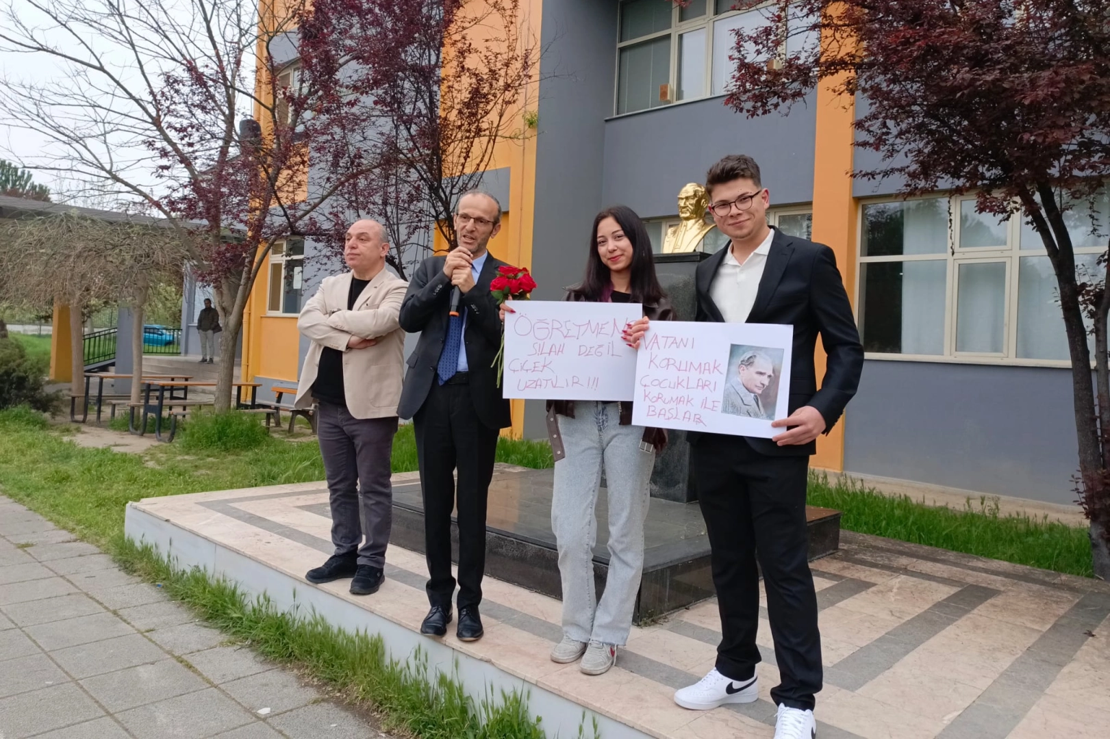 Şanlıurfa ve Kahramanmaraş’ta yaşanan üzücü olayların ardından, Şehit Erol Olçok Turizm Mesleki ve Teknik Anadolu Lisesi’nden bir gurup öğrenci, arkadaşlarını ve öğretmenlerini çiçeklerle karşıladı.