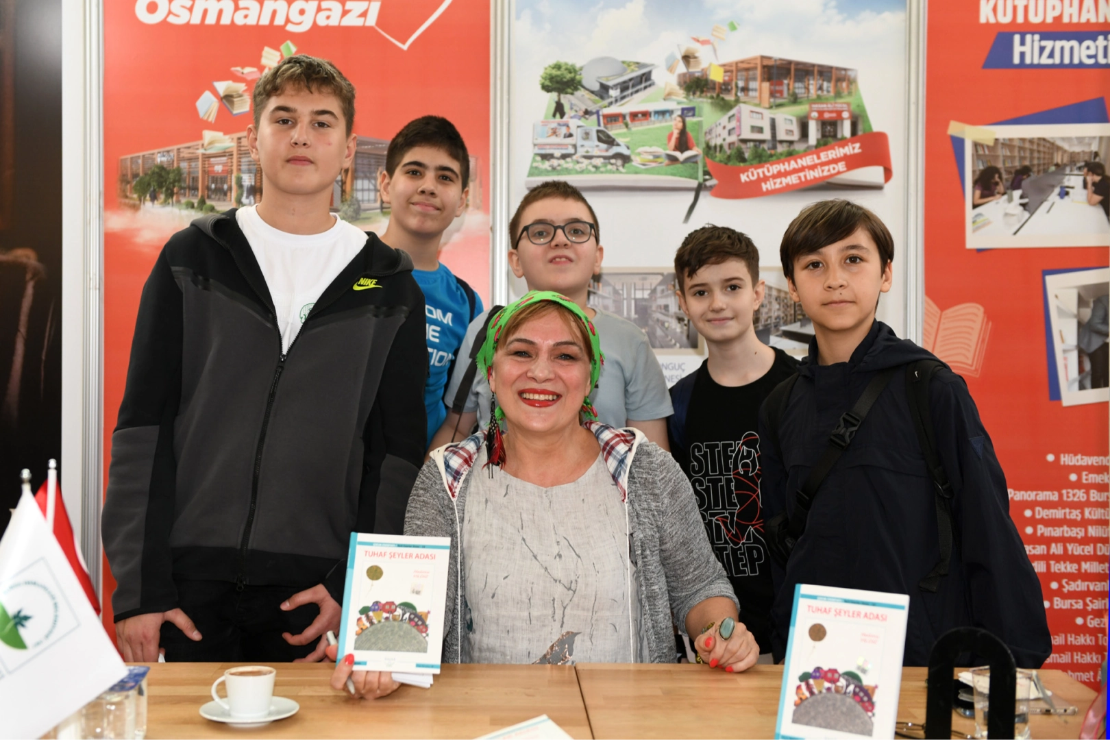 Osmangazi Belediyesi, 22. Bursa Kitap Fuarı’nda düzenlediği imza günü etkinliklerinde kitapseverler ile yazarları buluşturmaya devam ediyor. Bursa Kitap Fuarı’nda açtığı stantta her gün birbirinden değerli edebiyatçıları konuk eden Osmangazi Belediyesi, son olarak yazar Halime Yıldız’ı ağırladı. Çocuk ve gençlere yönelik kaleme aldığı kitaplar ile zengin bir okuyucu kitlesine sahip olan Halime Yıldız’ın imza gününe özellikle küçük kitapseverlerin ilgisi büyük oldu. Osmangazi Belediyesi tarafından kendilerine armağan edilen Kertenkelime ve Tuhaf Şeyler Adası kitaplarını alarak sıraya giren öğrenciler, kitapların yazarı Halime Yıldız ile hem tanışmanın hem kitaplarını imzalatmanın mutluluğunu yaşadı.