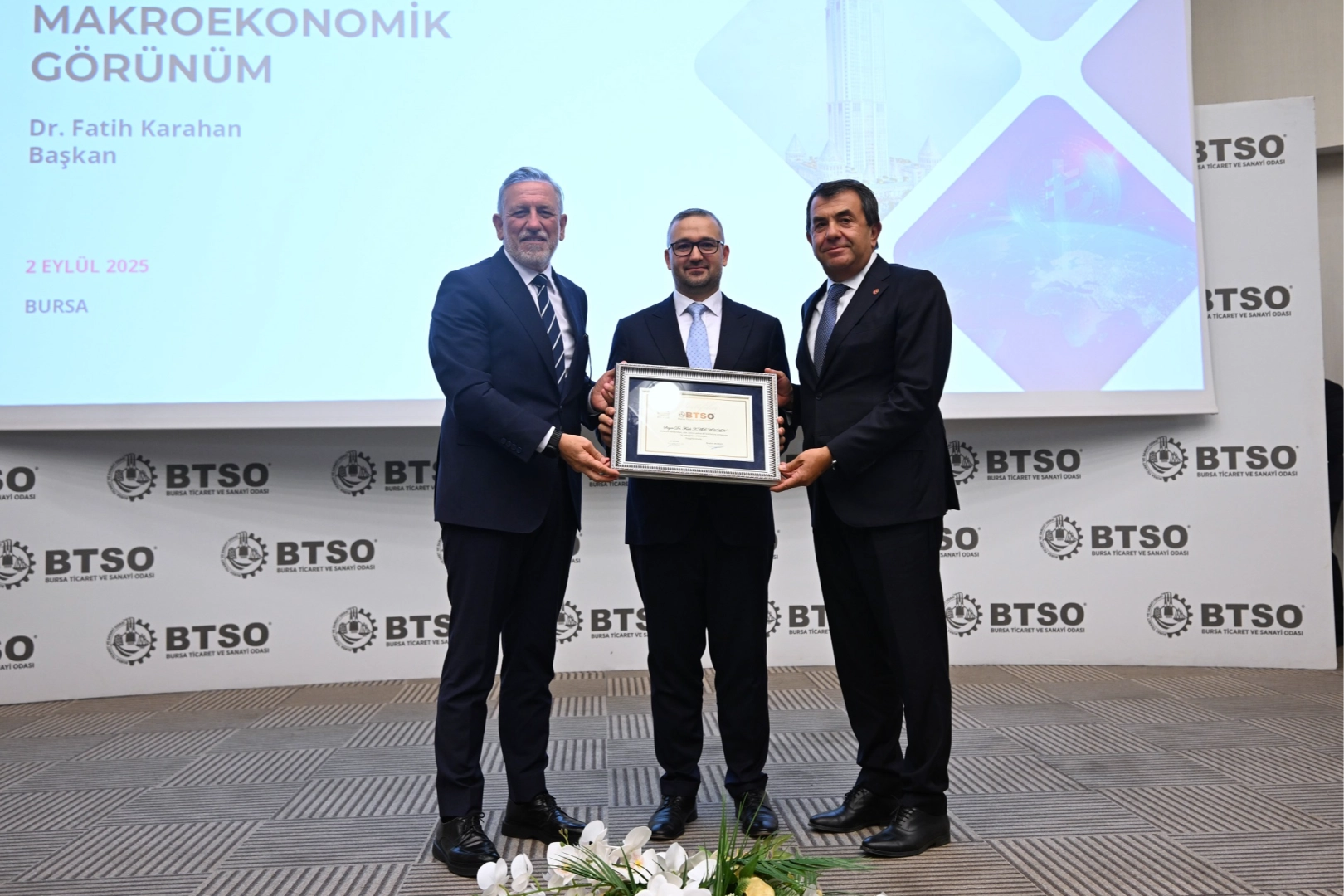 BTSO, Merkez Bankası Başkanı Fatih Karahan’ı Bursa iş dünyası ile bir araya getirdi. BTSO Yönetim Kurulu Başkanı İbrahim Burkay, toplantının açılışında yaptığı konuşmada, Bursa Ticaret ve Sanayi Odası olarak iş dünyasının sorunlarını, taleplerini ve önerilerini en doğru zeminde paylaşmayı sürdürdüklerini, Bursa’nın ve Türkiye’nin ekonomik istikrarına ve sürdürülebilir büyümesine katkı sağlayacak politikalara destek olmayı amaçladıklarını söyledi.