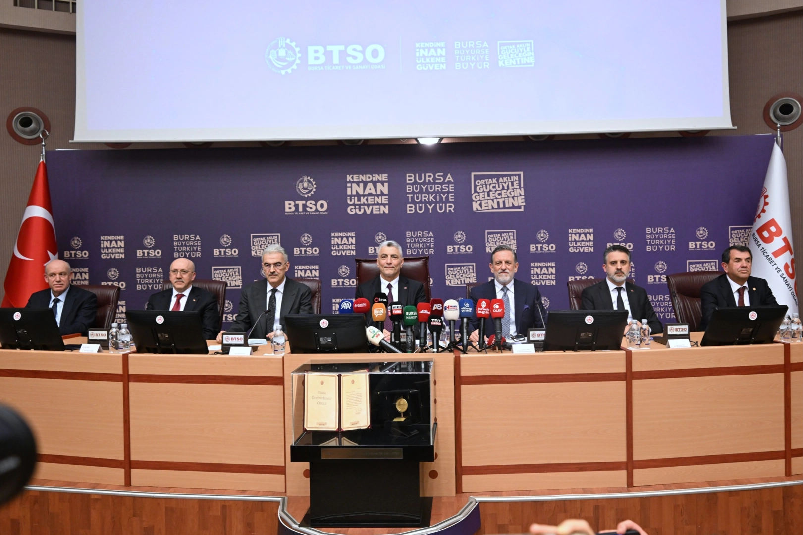 BTSO Yönetim Kurulu Başkanı İbrahim Burkay, Bursa’nın ekonomik performansına dikkat çekerek kentin Türkiye’nin büyüme ve ihracat hedeflerinde kilit rol üstlendiğini söyledi. Başkan Burkay, “20 milyar doların üzerindeki ihracatımız ve 36 milyar dolarlık dış ticaret hacmimizle Türkiye ekonomisinin lokomotif şehirlerinden biriyiz. 200’ün üzerinde ülke ve gümrük bölgesine ihracat yapan firmalarımızla küresel ticarette güçlü bir konuma sahibiz.” dedi. Küresel zorluklara rağmen elde edilen bu başarının güçlü bir üretim altyapısı ve girişimcilik ekosisteminin sonucu olduğunu vurgulayan Burkay, tüm zorluklara rağmen bu başarıların altında imzası bulunan iş dünyası temsilcilerine ve destekleri için Ticaret Bakanlığı’na teşekkür etti.