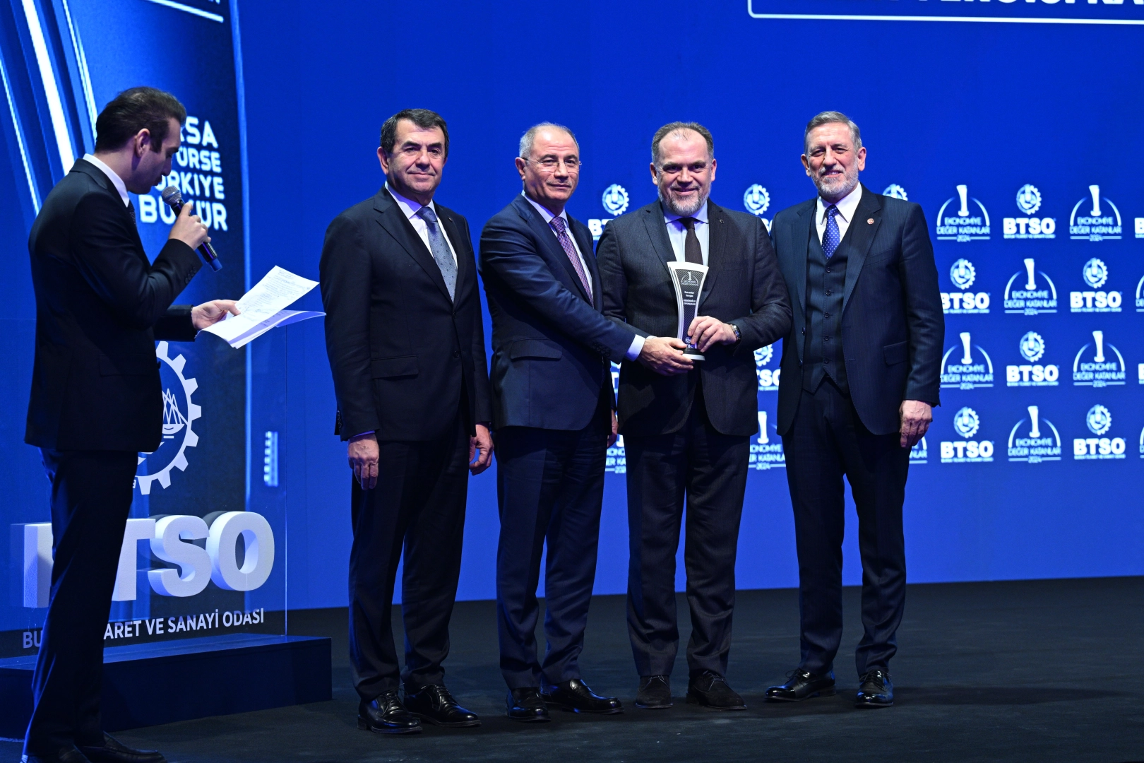 Bursa Ticaret ve Sanayi Odası (BTSO) tarafından geleneksel olarak düzenlenen Ekonomiye Değer Katanlar Ödülleri, Cumhurbaşkanı Recep Tayyip Erdoğan’ın da katıldığı törenle bu yılki sahiplerini buldu. ‘İhracat’, ‘Sektör Liderleri’, ‘Gelir Vergisi’, ‘Kurumlar Vergisi’, ‘Yeşil Çevre ve Sürdürülebilirlik’ kategorilerinde başarılarıyla örnek olan 37 kişi ve kurum ödülünü, Sanayi ve Teknoloji Bakanı Fatih Kacır, Ticaret Bakanı Ömer Bolat, İçişleri Bakanı Ali Yerlikaya, BTSO Yönetim Kurulu Başkanı İbrahim Burkay ve Meclis Başkanı Ali Uğur’un elinden aldı.