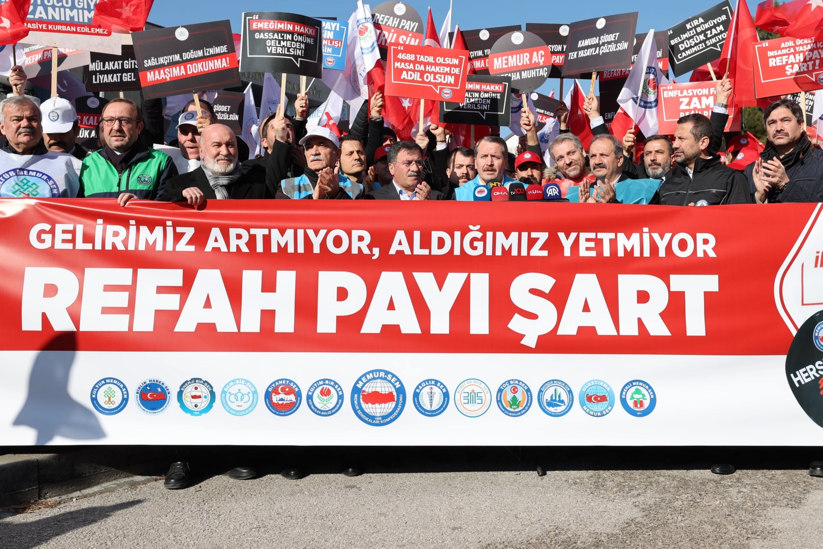 Memur-Sen ve bağlı sendikalara üye yaklaşık 200 kişilik grup, Hazine ve Maliye Bakanlığı önünde, ‘İnsanca yaşam için memura refah payı', ‘Emeğimi hor görme enflasyona ezdirme' sloganları attı. ‘Emeğimin hakkı gassalın önüne gelmeden verilsin' ‘Enflasyon farkı zam değildir', ‘memur refaha muhtaç' yazılı pankartların açıldığı eylemde konuşan Memur-Sen Genel Başkanı Ali Yalçın, 2025 yılının ilk günlerinde alım gücünün aşağı doğru baskılandığı bir süreçte ‘enflasyona ezdirmeyeceğiz' sözünü tartıştıklarını dile getirdi. Yalçın, yıllık enflasyonun yüzde 44,38 olarak gerçekleştiğini hatırlatarak, “Değerli emekçi arkadaşların bugün bu durumu haykırmak, sesimizi duyurmak, kapalı görevlerine reva görülen yüzde 11,54'lük zamma karşı gelirimiz artmıyor, aldığımız yetmiyor diyerek Hazine Maliye Bakanlığı önünde refah payı talebimizi dillendirmek için bir aradayız. Yıllık enflasyon yüzde 44,38 olarak gerçekleşti. Hepimiz hissedilen enflasyonun açıklanan enflasyonla uyumsuz olduğunu, ilişkisinin olmadığını biliyor ve yaşıyoruz. Sabit gelirlerin, kira, elektrik, doğal gaz, gıda, zorunlu harcamalarından oluşan sepetinin açık alınan enflasyonla uyuşması mümkün değil” açıklamasında bulundu. “YILBAŞINDAN İTİBAREN EKMEĞE YÜZDE 25 ZAM GELDİ, KİRALAR İSE YÜZDE 60 YÜKSELECEK”