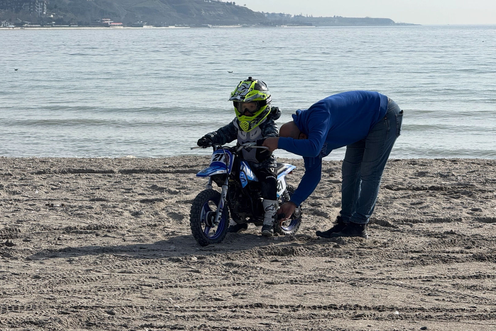 Ailesinin denetiminde Büyükçekmece'de kumsalda antrenman yapan minik motocross sporcusu çevrede izleyen vatandaşların da büyük ilgisini çekti.