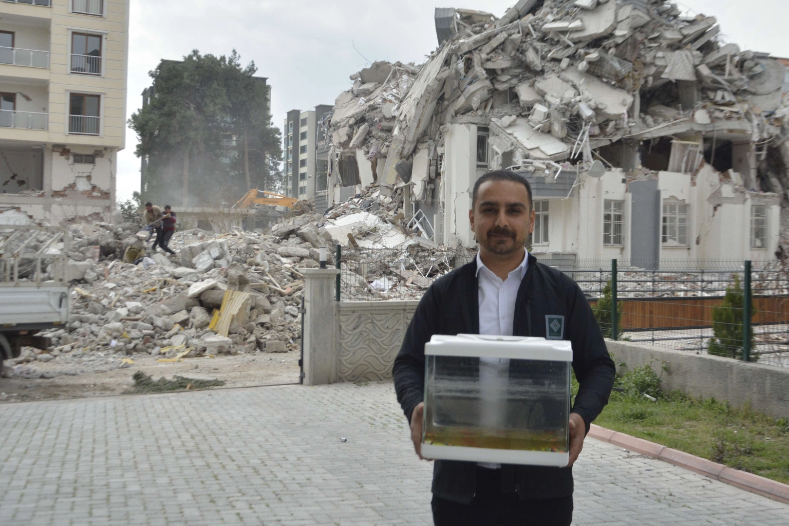 Yaşadıkları bölgede binaların deprem sırasında yıkıldığını, kendi oturduğu binanın da hasarlı olduğunu belirten Gökhan Akyürek, “Osmaniye Belediyesi'nde ilk günden beri görev almaktayım. Sahalardayız, vatandaşa hizmet götürebilmek için çalışıyoruz. Deprem anında eşim çocuk odasına girdiğinde yerlerin ıslak olduğunu, balığın fanusunun devrildiğini düşünmüş olacak ki balıklarımız da öldü diye söylemişti. Tam 44 gün sonra ben evi toparlamaya çıktığımda balıkların hala hayatta olduklarını ve çok az miktar su ile hayatta kalabildiklerine şahit oldum. Tüylerim diken diken oldu açıkçası. Bunu da bir videoyla desteklemek istedim, paylaşmak istedim. Normal şartlarda herhangi bir su motoru bulunmuyor içerisinde az bir miktarda suyla bir iki hafta maksimum yaşayabilme sürelerinin olduğunu öğrendim, araştırdım. Öldürmeyen Allah öldürmez derler ya, o hesap balıklarımız hala hayatta ve mutluyuz” dedi.
