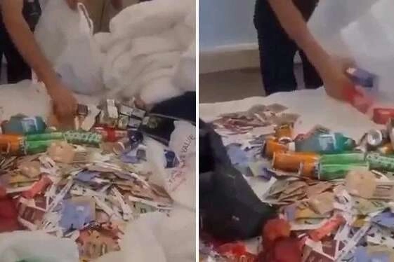 Sosyal medyada yayılan görüntülerde, otelin odasına giren görevliler bir turistin havlular, şampuanlar, gazlı içecekler, paketli çay çeşitleri, kuru yemiş ve çeşitli yiyeceklere kadar birçok ürünü odasında biriktirdiğini gördü.