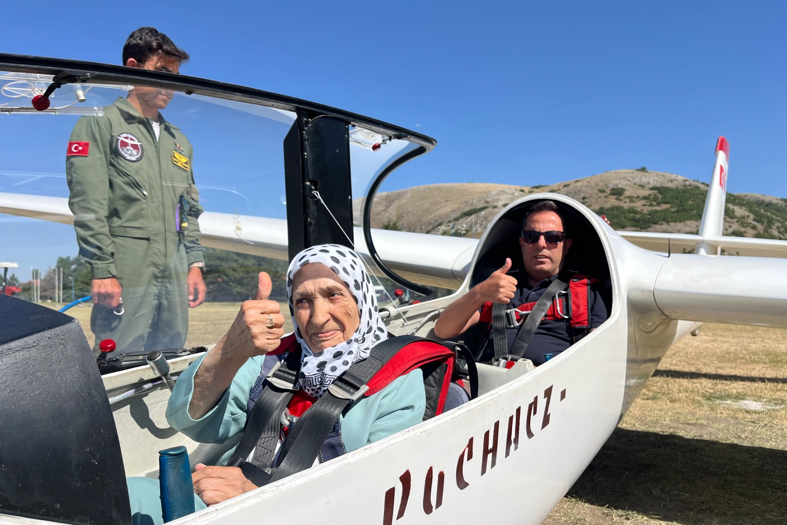 Geçmişte tır kullanan ve Avrupa'ya mal dahi taşıyan 83 yaşındaki Mürüvvet Dibsoy, girişimler ve alınan izinler sonucunda Türk Hava Kurumu (THK) İnönü Havacılık Eğitim Merkezi'ne geldi. Burada son kontrolleri yapılan Dibsoy, planörün kokpitine Kurumun Planör Uçuş Okulu Müdürü Murat Hozan ile birlikte oturdu. Müdür Hozan eşliğinde planörle kalkış yapan Mürüvvet Dipsoy'un heyecanın, kokpitteki aksiyon kamerasına anbean yansıdı. 700 metre yüksekliğe kadar çıkan Mürüvvet Dibsoy, Okul Müdürü Murat Hozan rehberliğinde manzaranın tadını çıkardı. İnişin ardında huzurevinden arkadaşları ve Müdüresi Seyhan Şimşek tarafından alkışlarla karşılandı.
